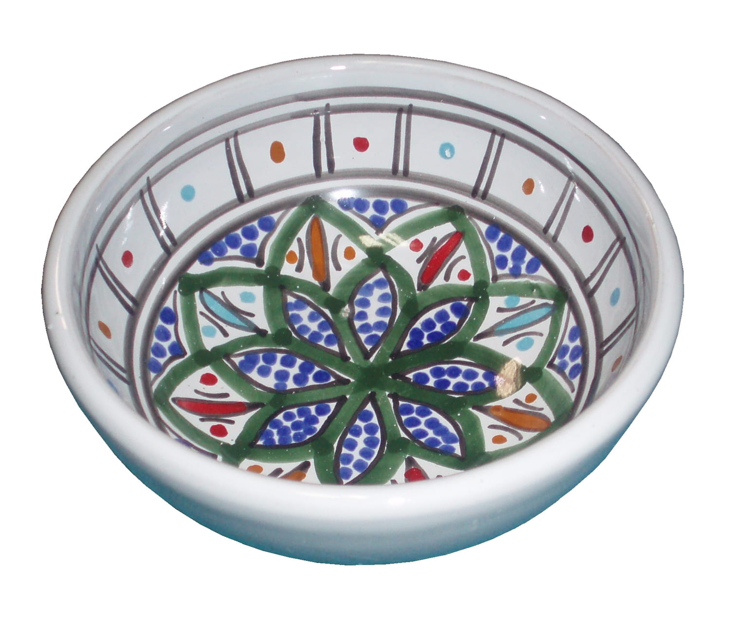 Zwraca uwagę piękne wzornictwo i bogata arabska kolorystyka. Miseczka malowana jest w berberyjskie wzory. Przepiękna, niebanalna ozdoba Twojego stołu - ozdobny,a jednocześnie funkcjonalny gadżet pochodzący z Tunezji.