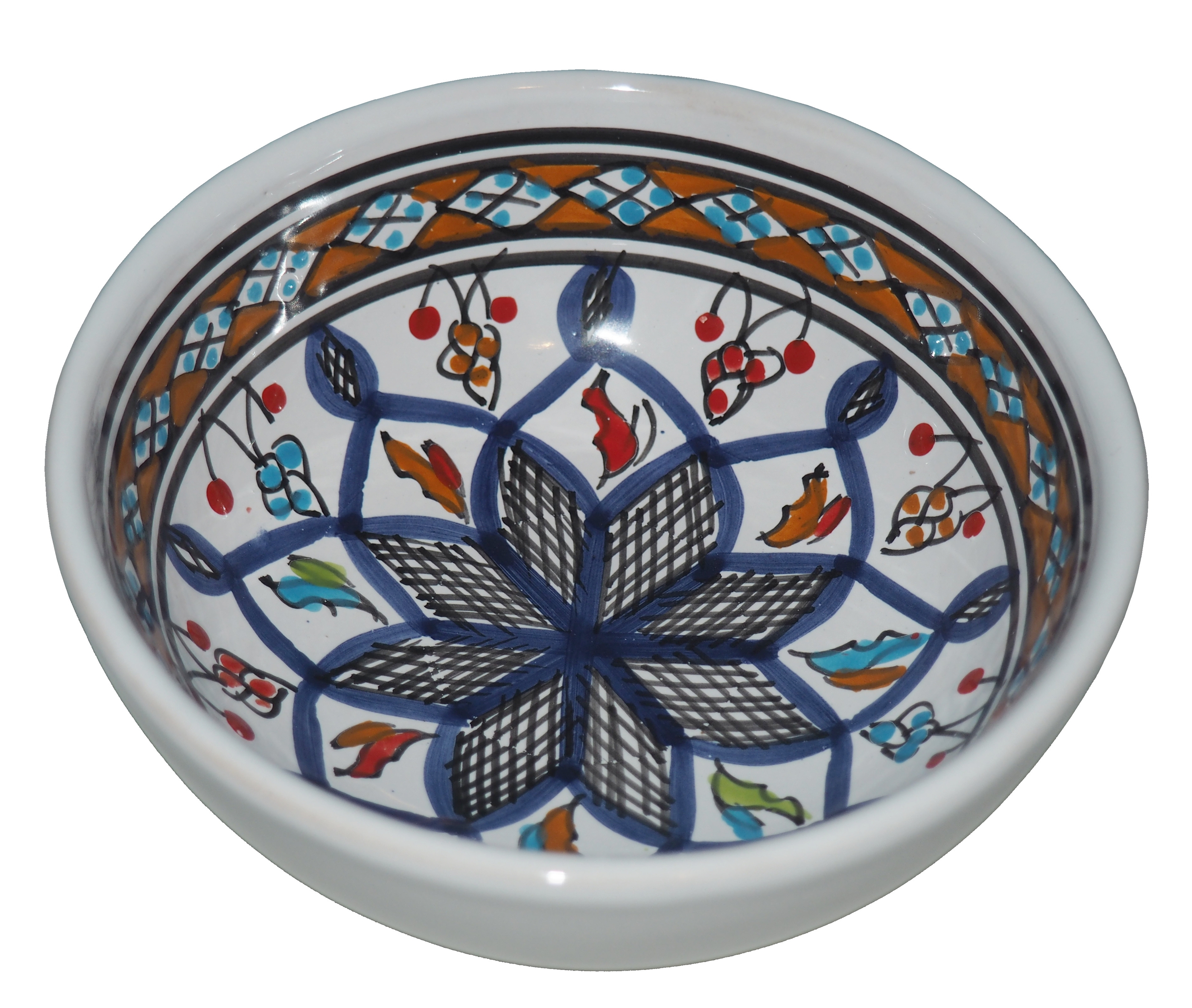 Zwraca uwagę piękne wzornictwo i bogata arabska kolorystyka. Miseczka malowana jest w berberyjskie wzory. Przepiękna, niebanalna ozdoba Twojego stołu prosto z Tunezji.