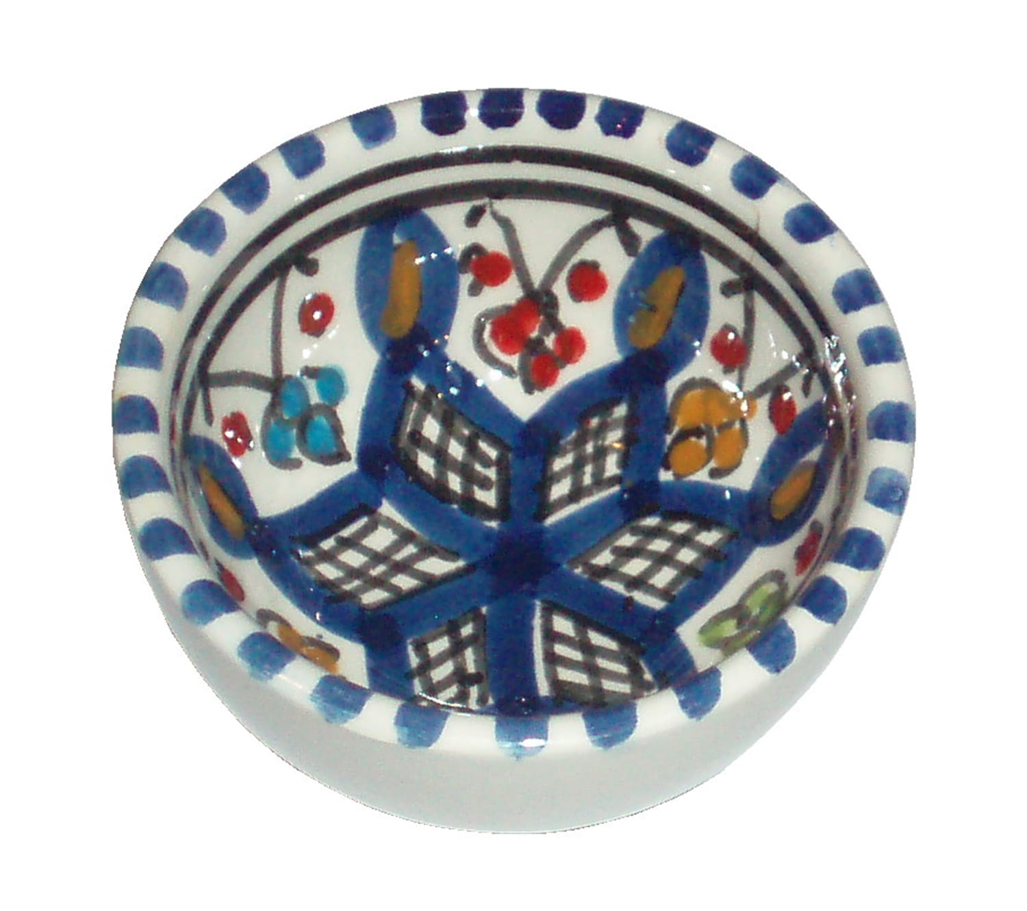 Zwraca uwagę piękne wzornictwo i bogata arabska kolorystyka. Miseczka malowana jest w berberyjskie wzory. Przepiękna, niebanalna ozdoba Twojego stołu - śliczna miseczka prosto z Tunezji.