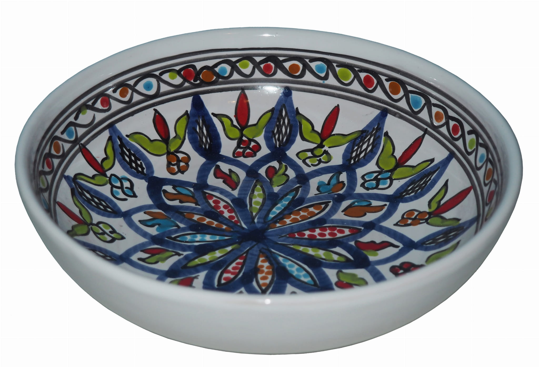 Orientalny talerz malowany jest w berberyjskie wzory. Przepiękna, niebanalna ozdoba Twojego stołu prosto z Tunezji.