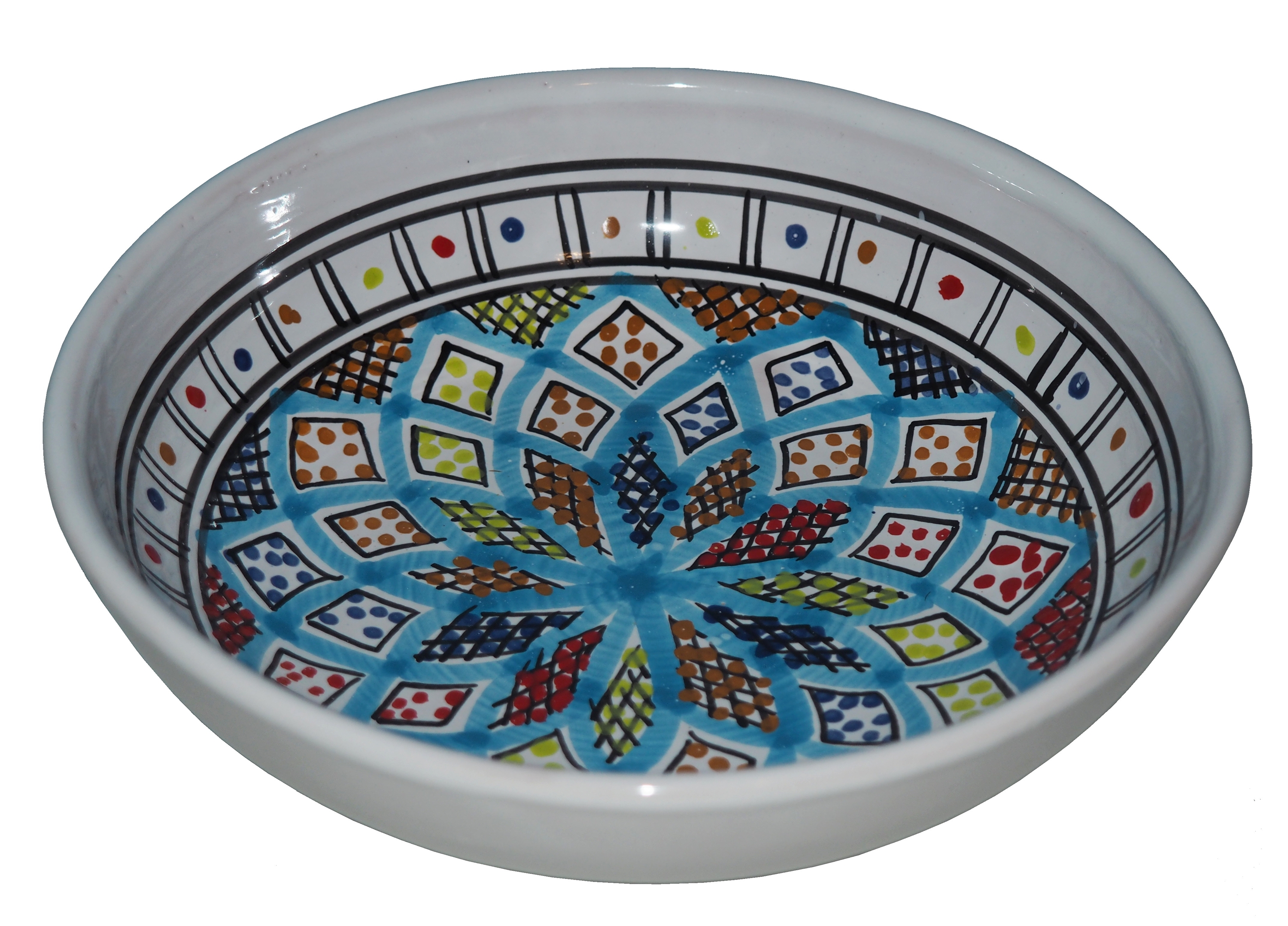 Orientalny talerz malowany jest w berberyjskie wzory. Przepiękna, niebanalna ozdoba Twojego stołu prosto z Tunezji.