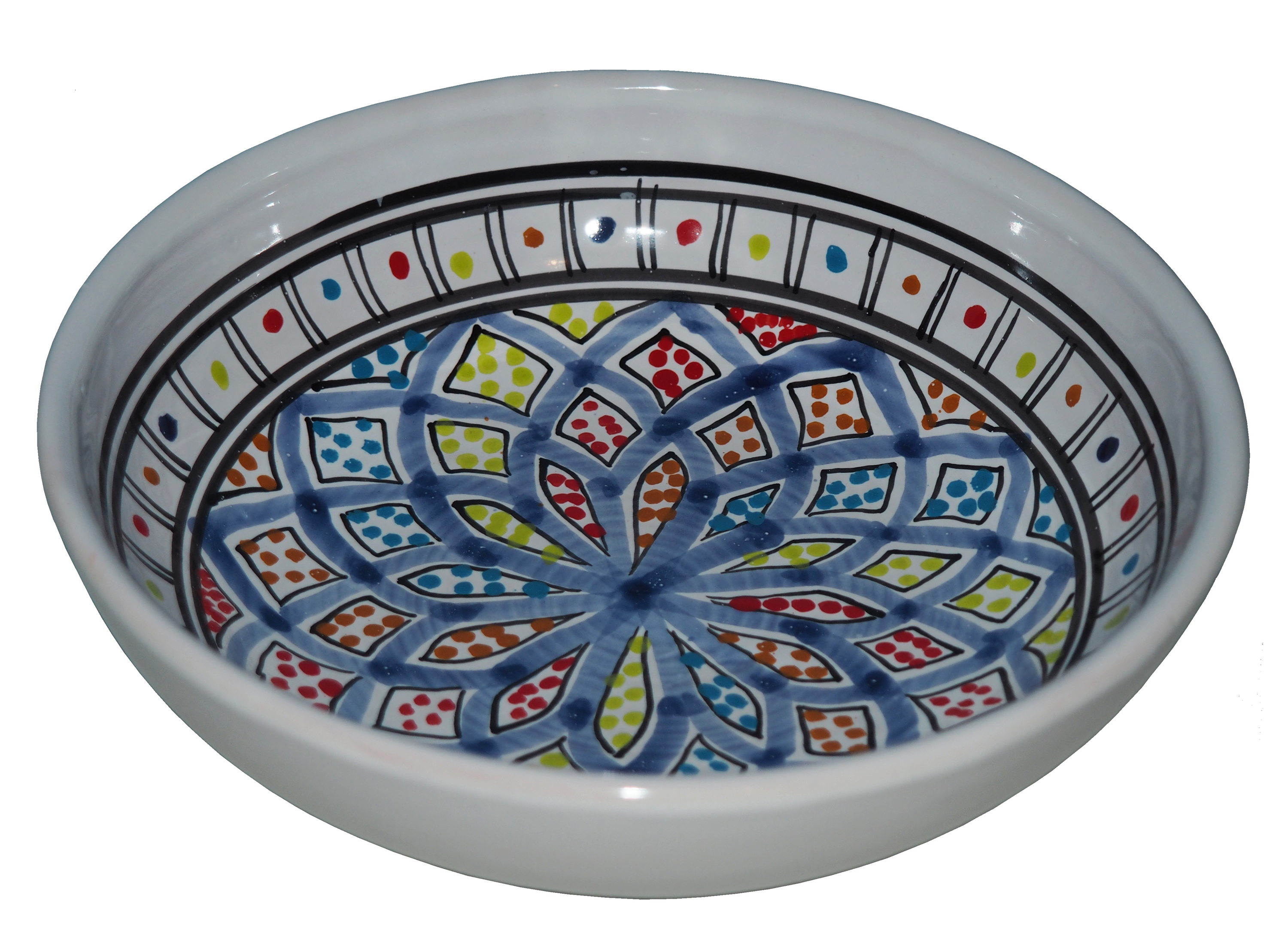 Orientalny talerz malowany jest w berberyjskie wzory. Przepiękna, niebanalna ozdoba Twojego stołu prosto z Tunezji.