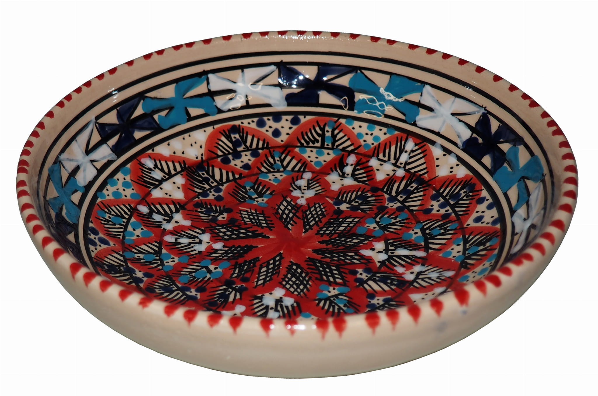 Orientalny talerz malowany jest w berberyjskie wzory. Przepiękna, niebanalna ozdoba Twojego stołu prosto z Tunezji.