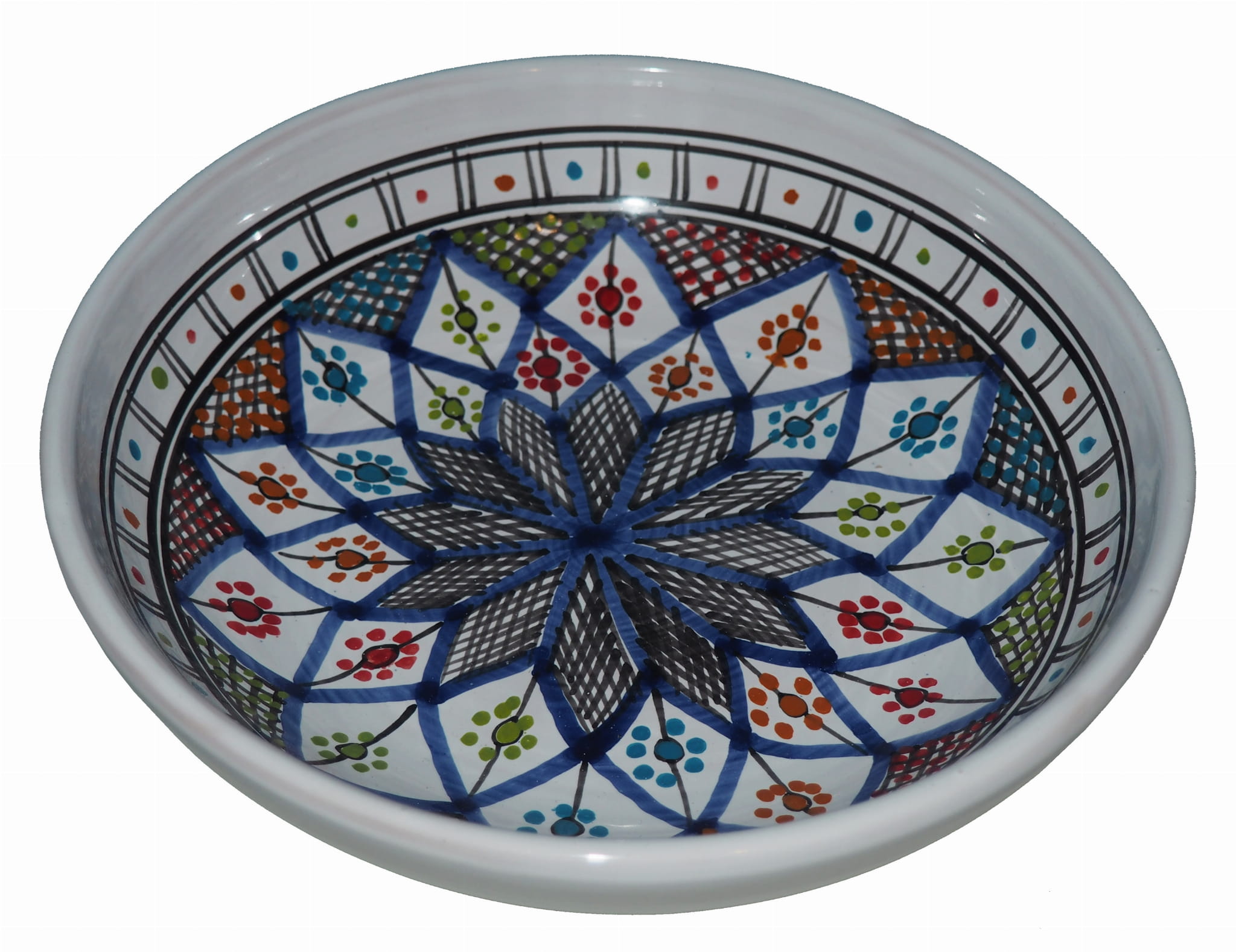 Ten orientalny talerz malowany jest w berberyjskie wzory. Przepiękna, niebanalna ozdoba Twojego stołu - ozdobna i funkcjonalna ceramika prosto z Tunezji.