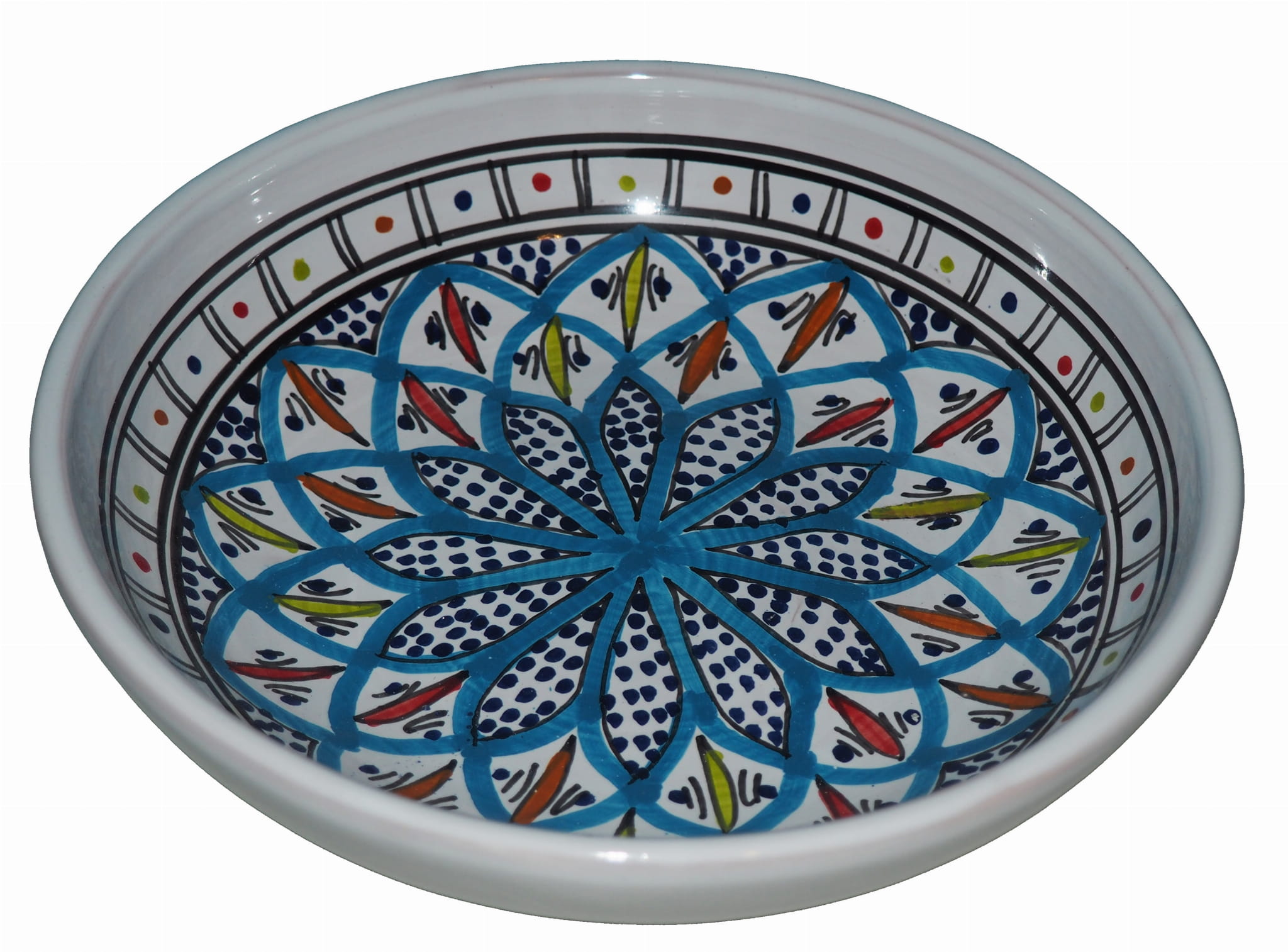 Ten orientalny talerz malowany jest w berberyjskie wzory. Przepiękna, niebanalna ozdoba Twojego stołu - ozdobna i funkcjonalna ceramika prosto z Tunezji.