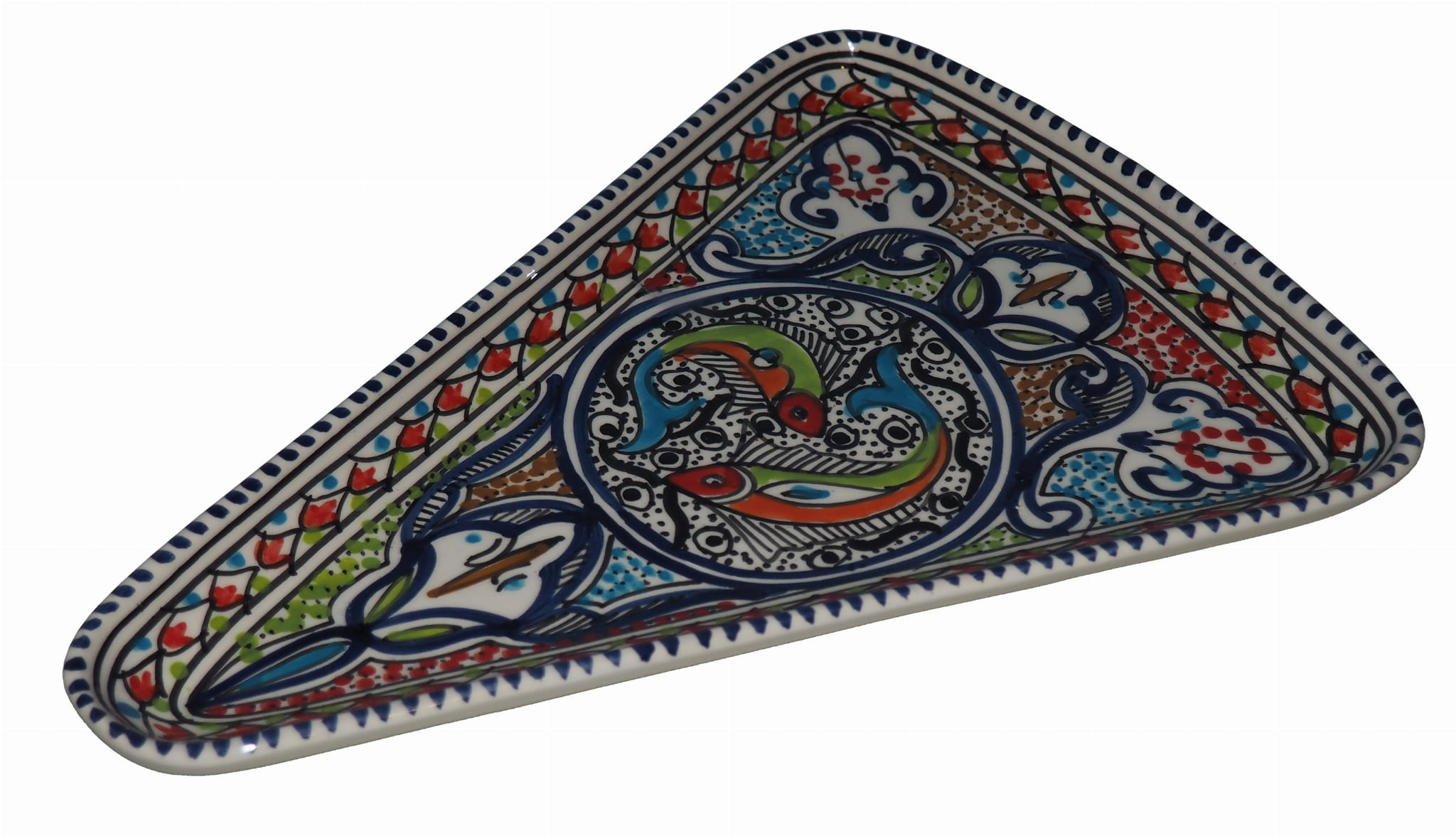 Ten orientalny talerz malowany jest w berberyjskie wzory. Przepiękna, niebanalna ozdoba Twojego stołu - ozdobna i funkcjonalna ceramika prosto z Tunezji.