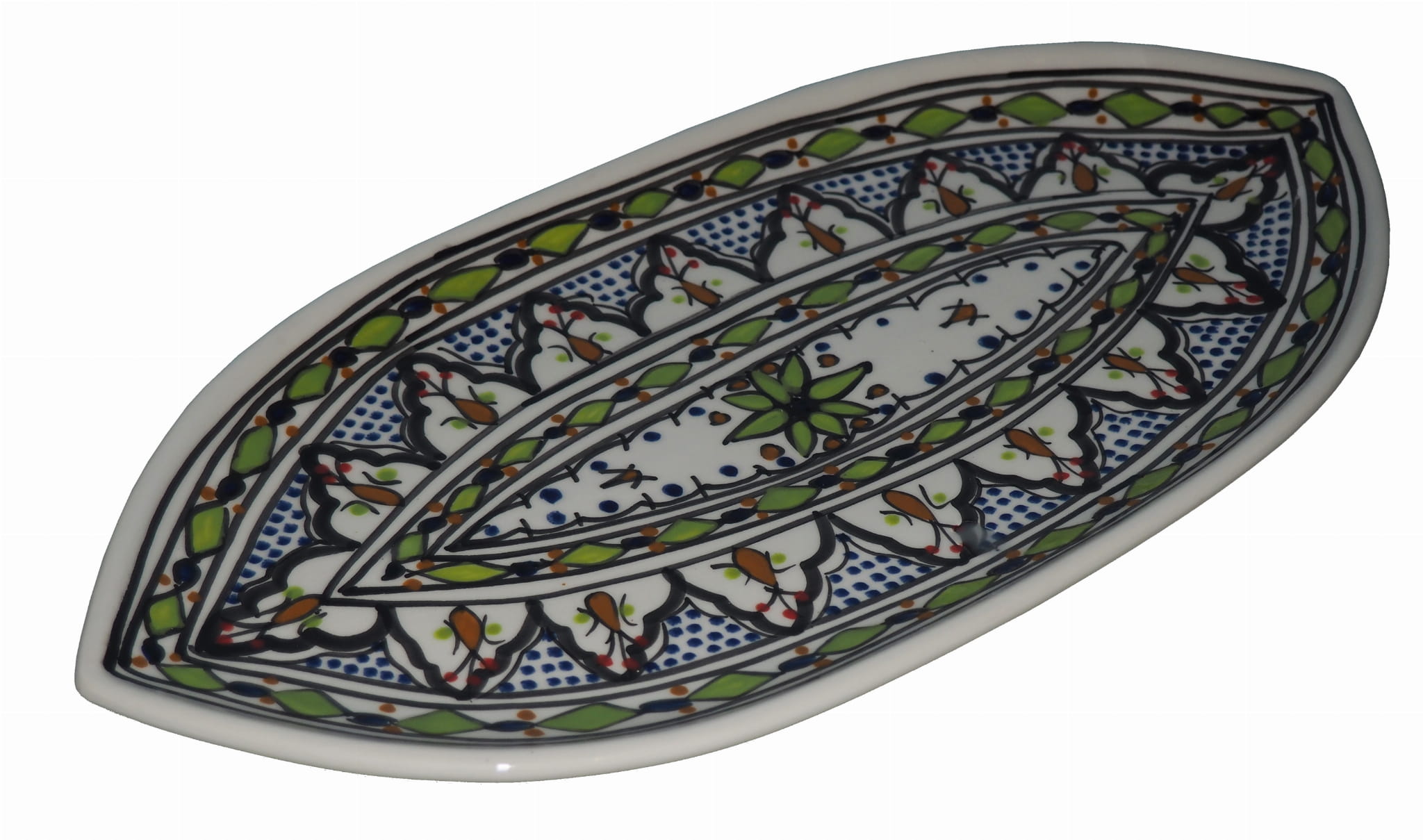 Ten orientalny talerz malowany jest w berberyjskie wzory. Przepiękna, niebanalna ozdoba Twojego stołu - ozdobna i funkcjonalna ceramika prosto z Tunezji.