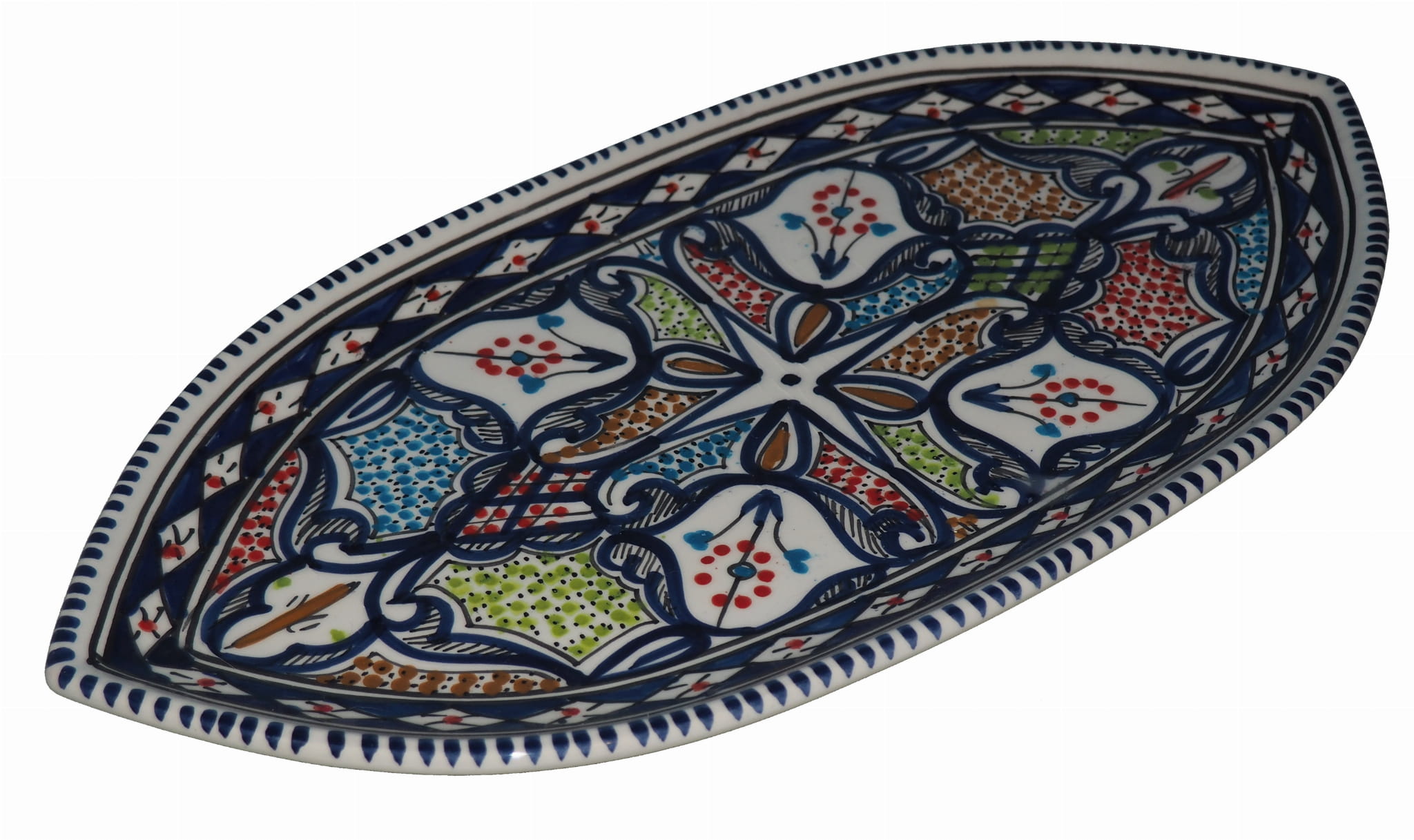 Ten orientalny talerz malowany jest w berberyjskie wzory. Przepiękna, niebanalna ozdoba Twojego stołu - ozdobna i funkcjonalna ceramika prosto z Tunezji.