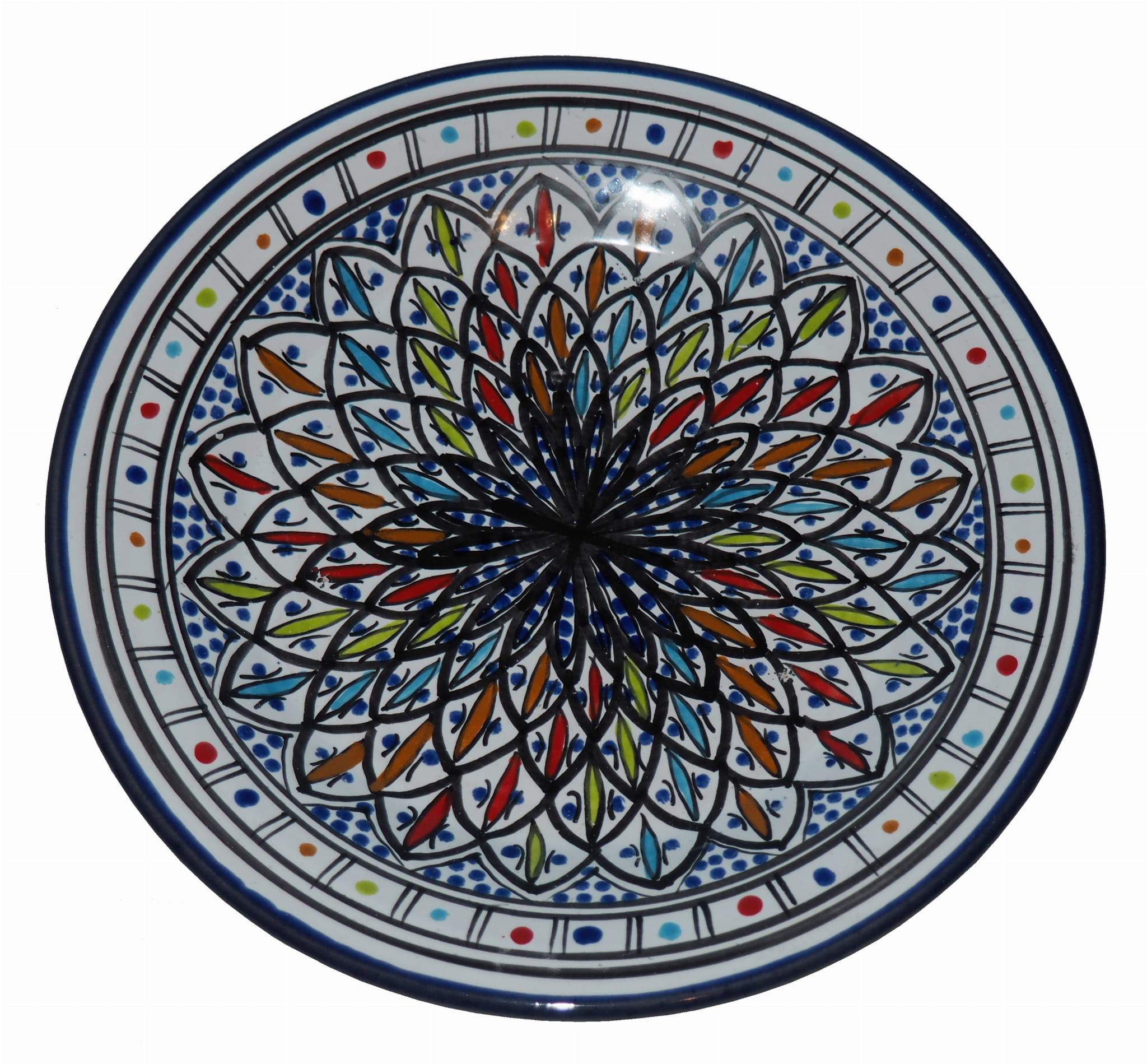 Ten orientalny talerz malowany jest w berberyjskie wzory. Przepiękna, niebanalna ozdoba Twojego stołu prosto z Tunezji.