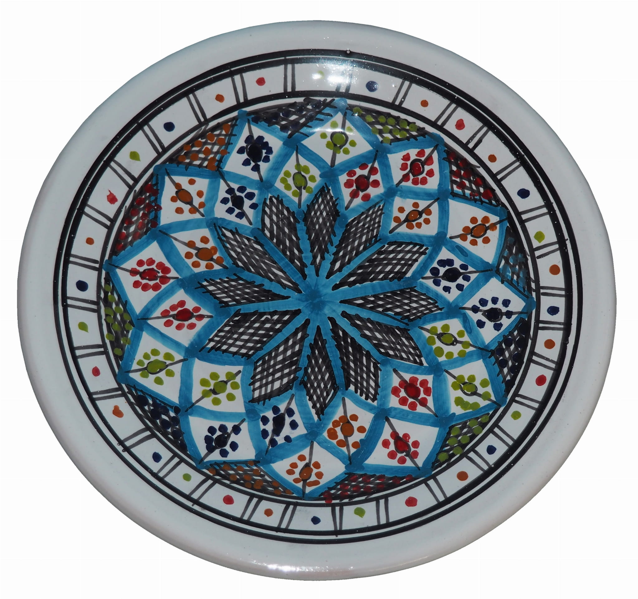 Ten orientalny talerz malowany jest w berberyjskie wzory. Przepiękna, niebanalna ozdoba Twojego stołu prosto z Tunezji.
