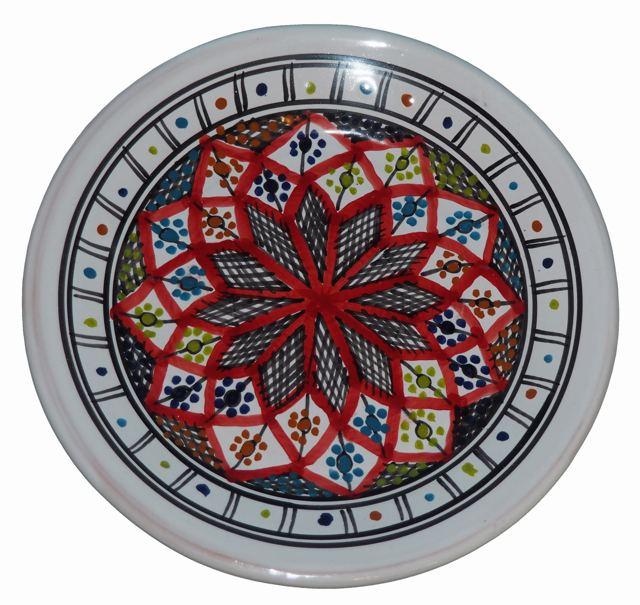 Ten orientalny talerz malowany jest w berberyjskie wzory. Przepiękna, niebanalna ozdoba Twojego stołu prosto z Tunezji.