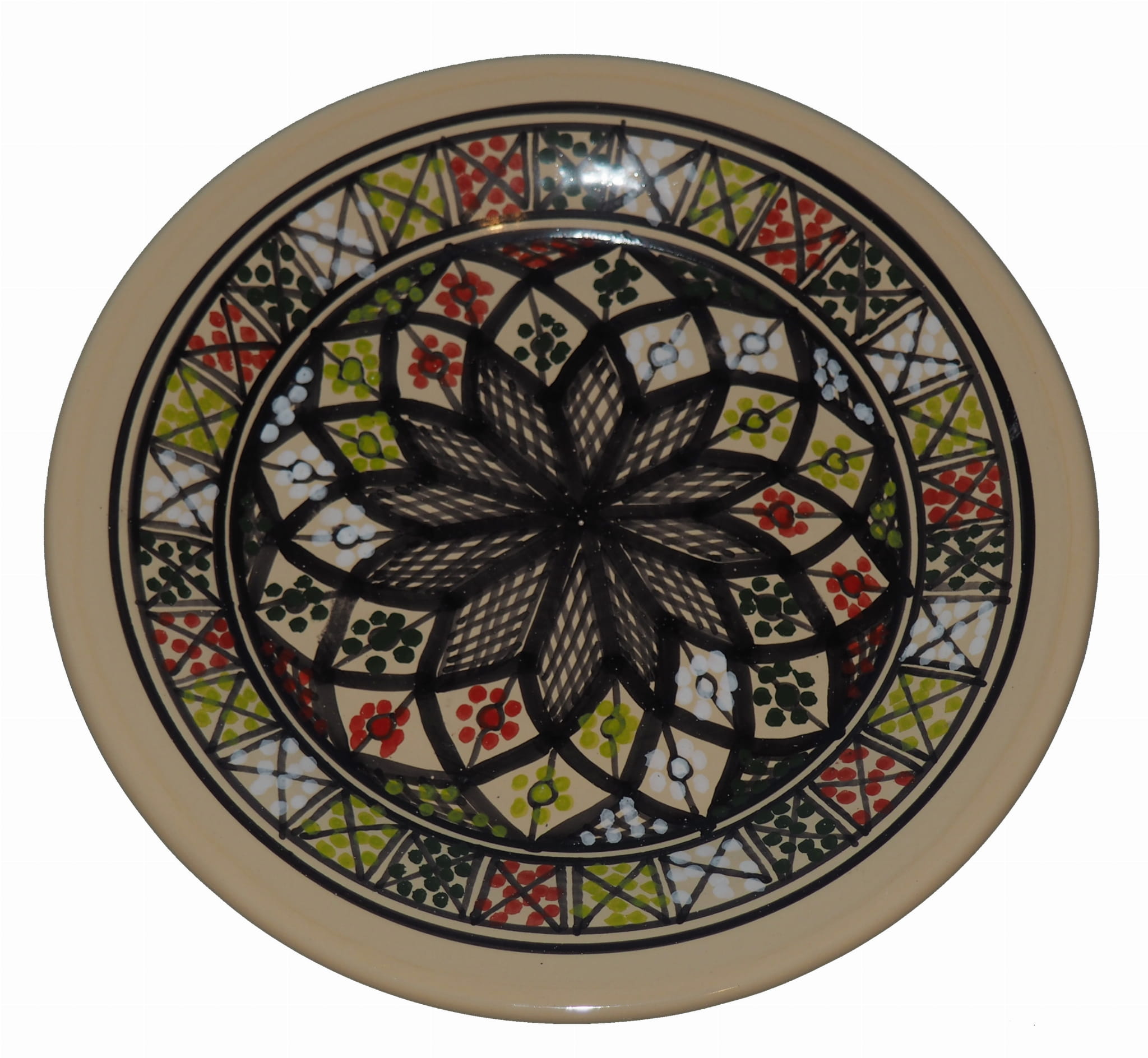 Ten orientalny talerz malowany jest w berberyjskie wzory. Przepiękna, niebanalna ozdoba Twojego stołu prosto z Tunezji.