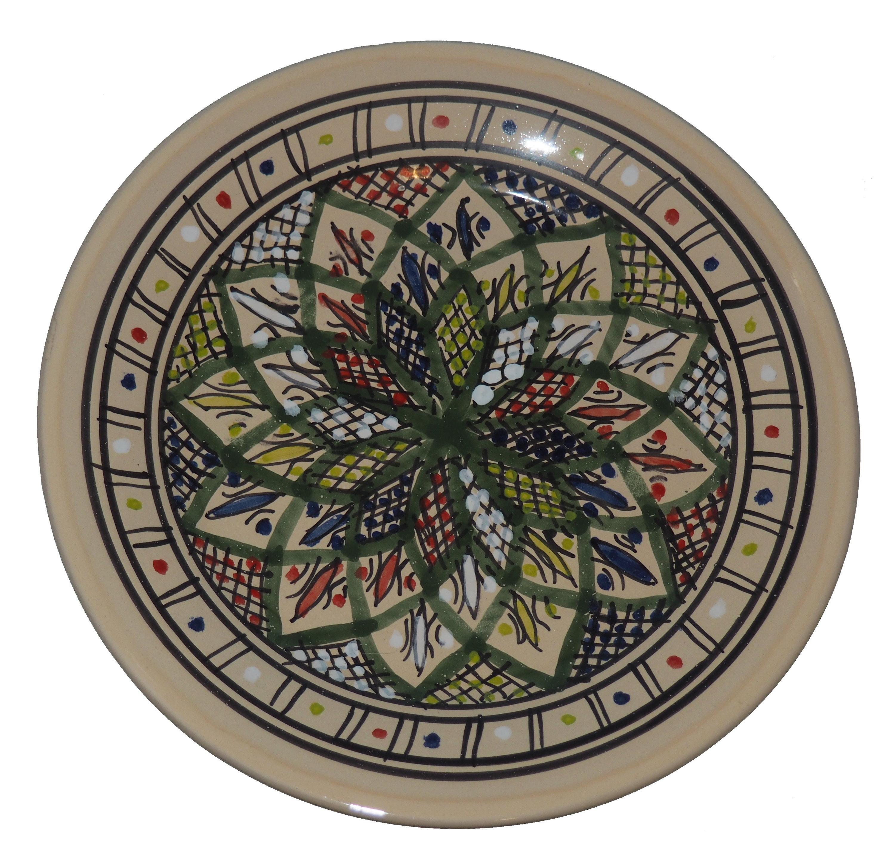 Ten orientalny talerz malowany jest w berberyjskie wzory. Przepiękna, niebanalna ozdoba Twojego stołu prosto z Tunezji.
