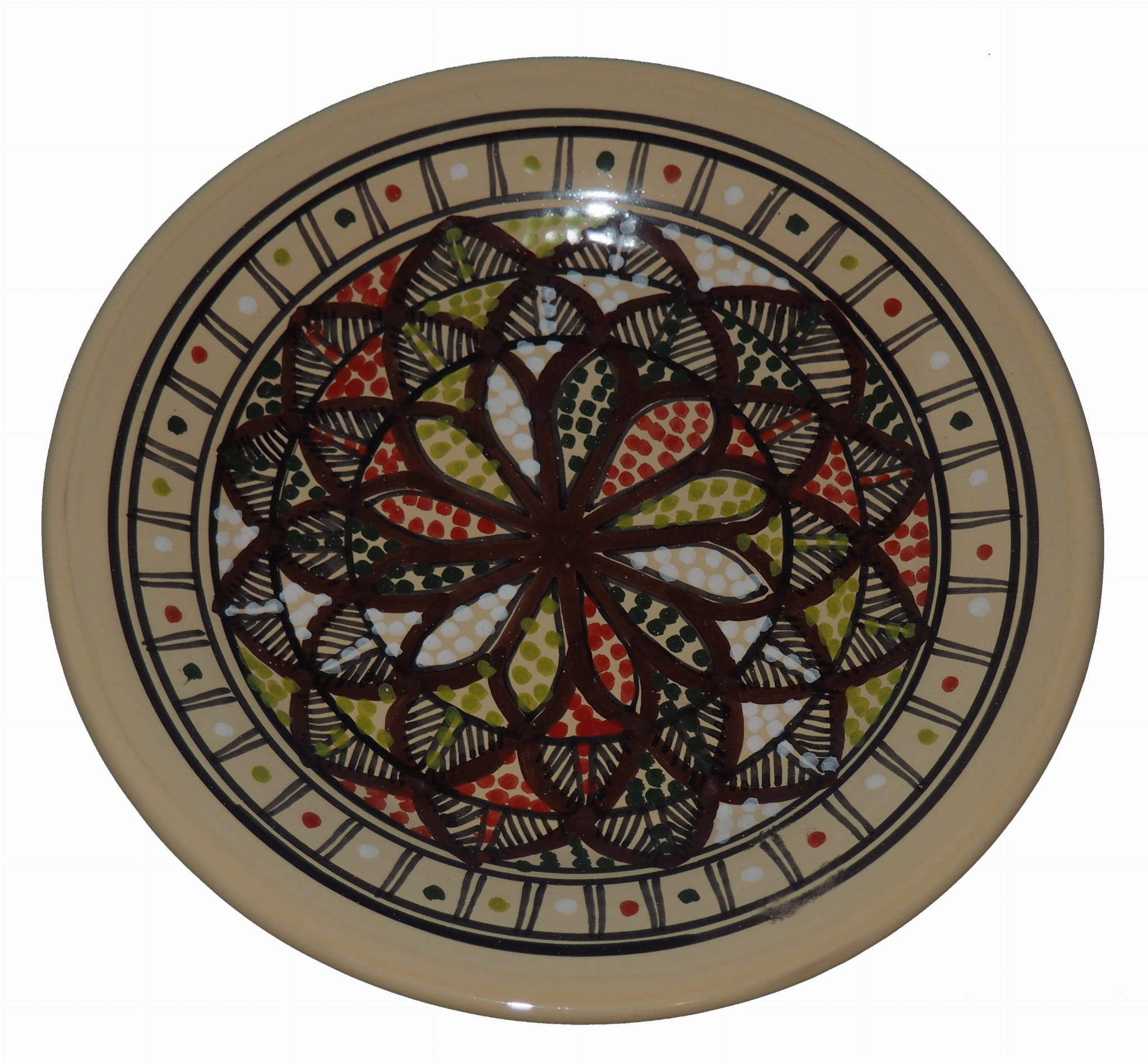 Ten orientalny talerz malowany jest w berberyjskie wzory. Przepiękna, niebanalna ozdoba Twojego stołu prosto z Tunezji.