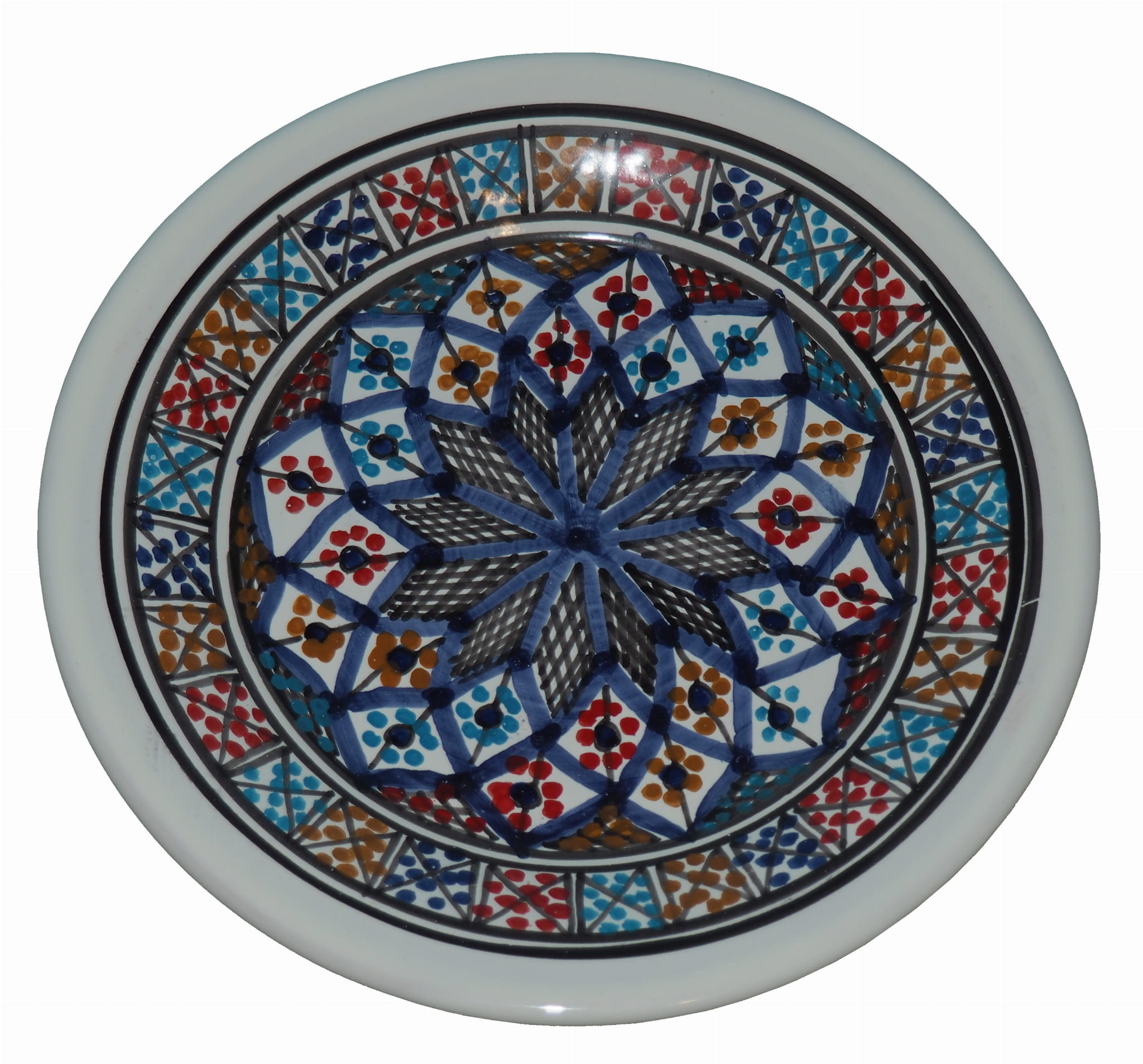 Ten orientalny talerz malowany jest w berberyjskie wzory. Przepiękna, niebanalna ozdoba Twojego stołu prosto z Tunezji.