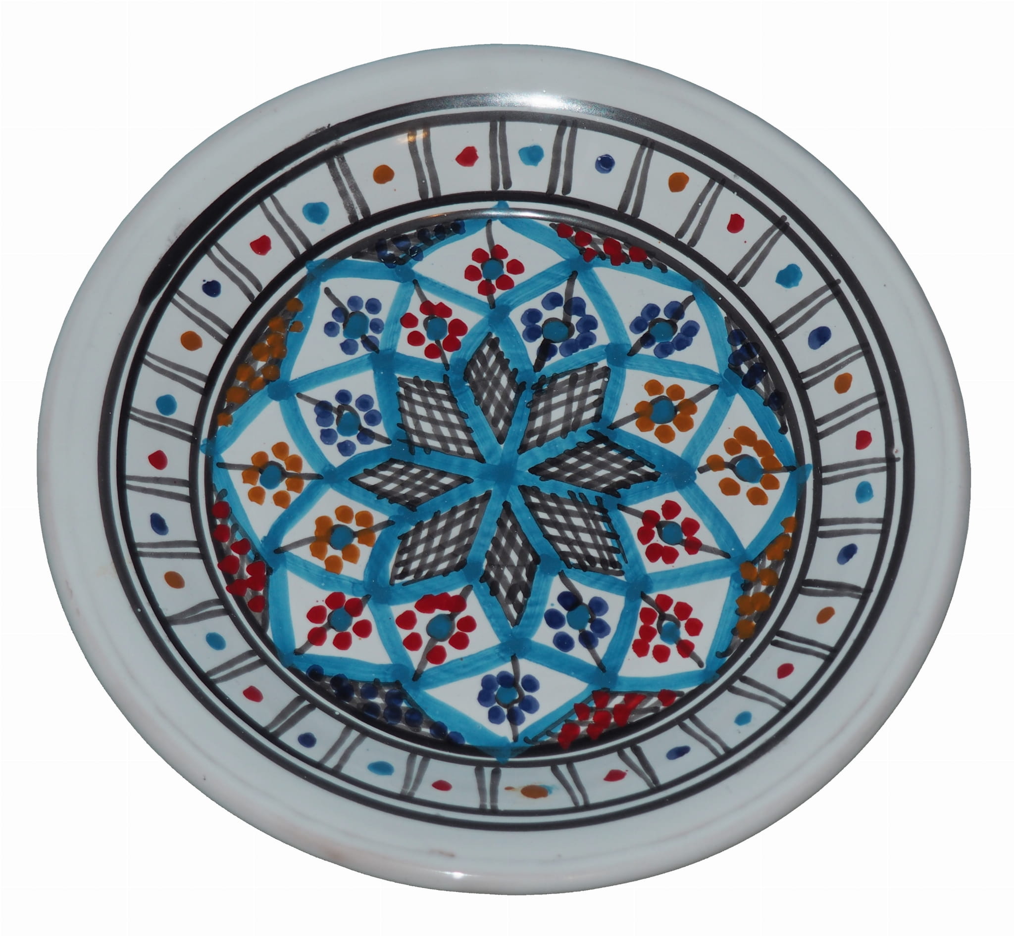 Ten orientalny talerz malowany jest w berberyjskie wzory. Przepiękna, niebanalna ozdoba Twojego stołu prosto z Tunezji.