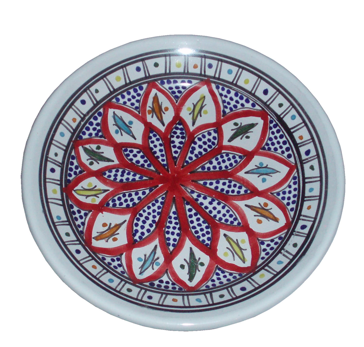 Ten orientalny talerz malowany jest w berberyjskie wzory. Przepiękna, niebanalna ozdoba Twojego stołu prosto z Tunezji.
