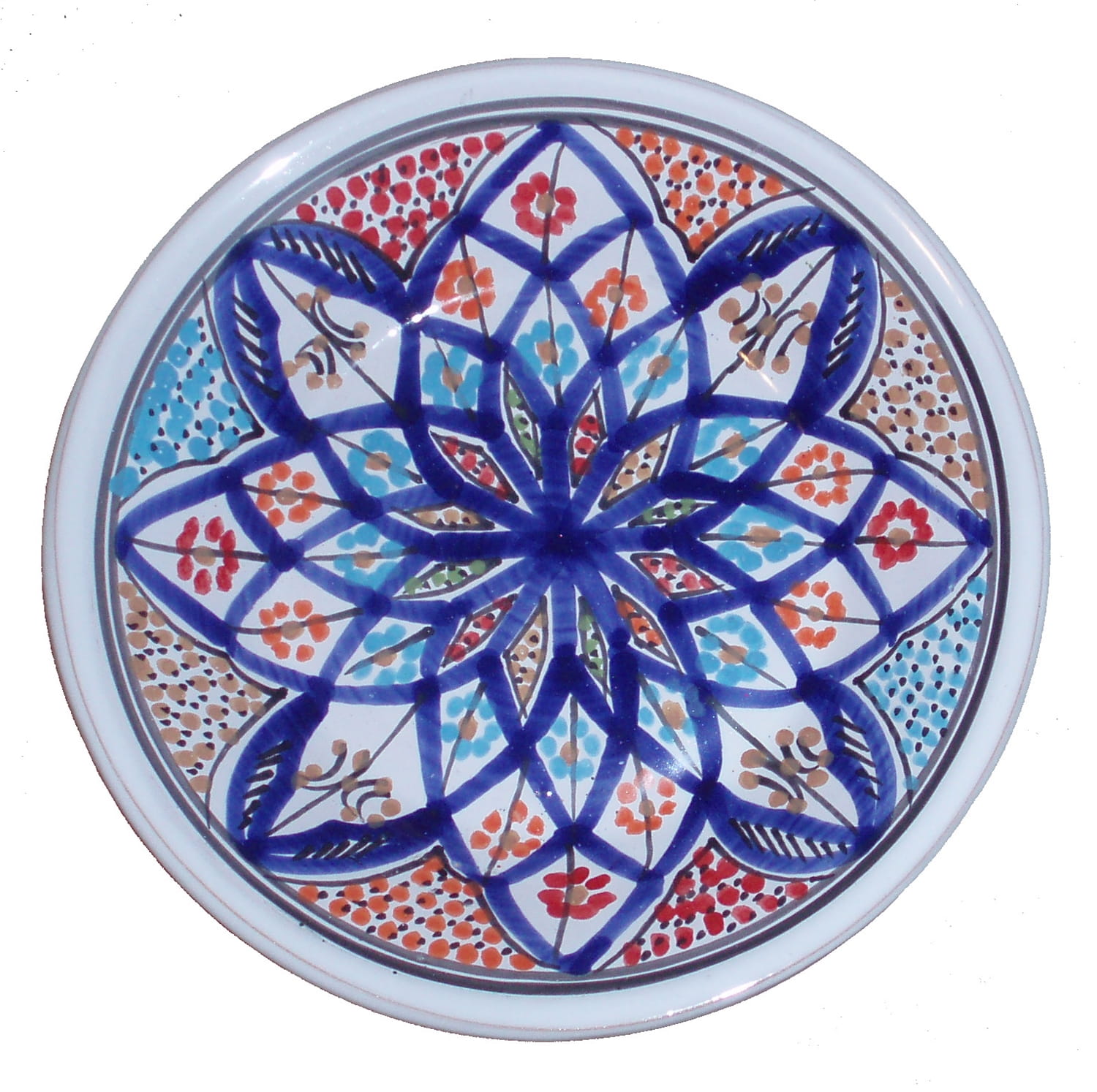 Ten orientalny talerz malowany jest w berberyjskie wzory. Przepiękna, niebanalna ozdoba Twojego stołu prosto z Tunezji.