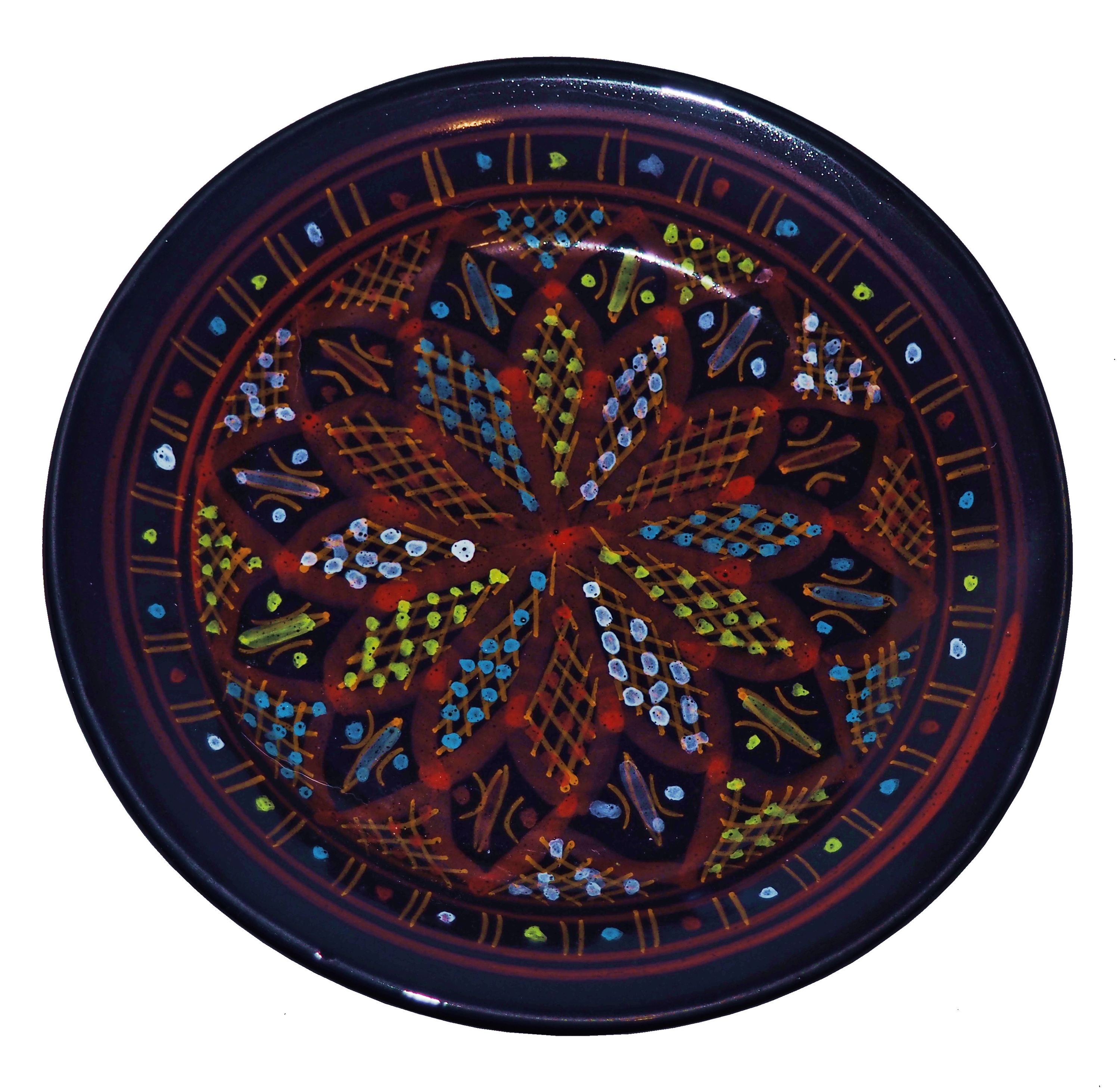 Ten orientalny talerz malowany jest w berberyjskie wzory. Przepiękna, niebanalna ozdoba Twojego stołu prosto z Tunezji.