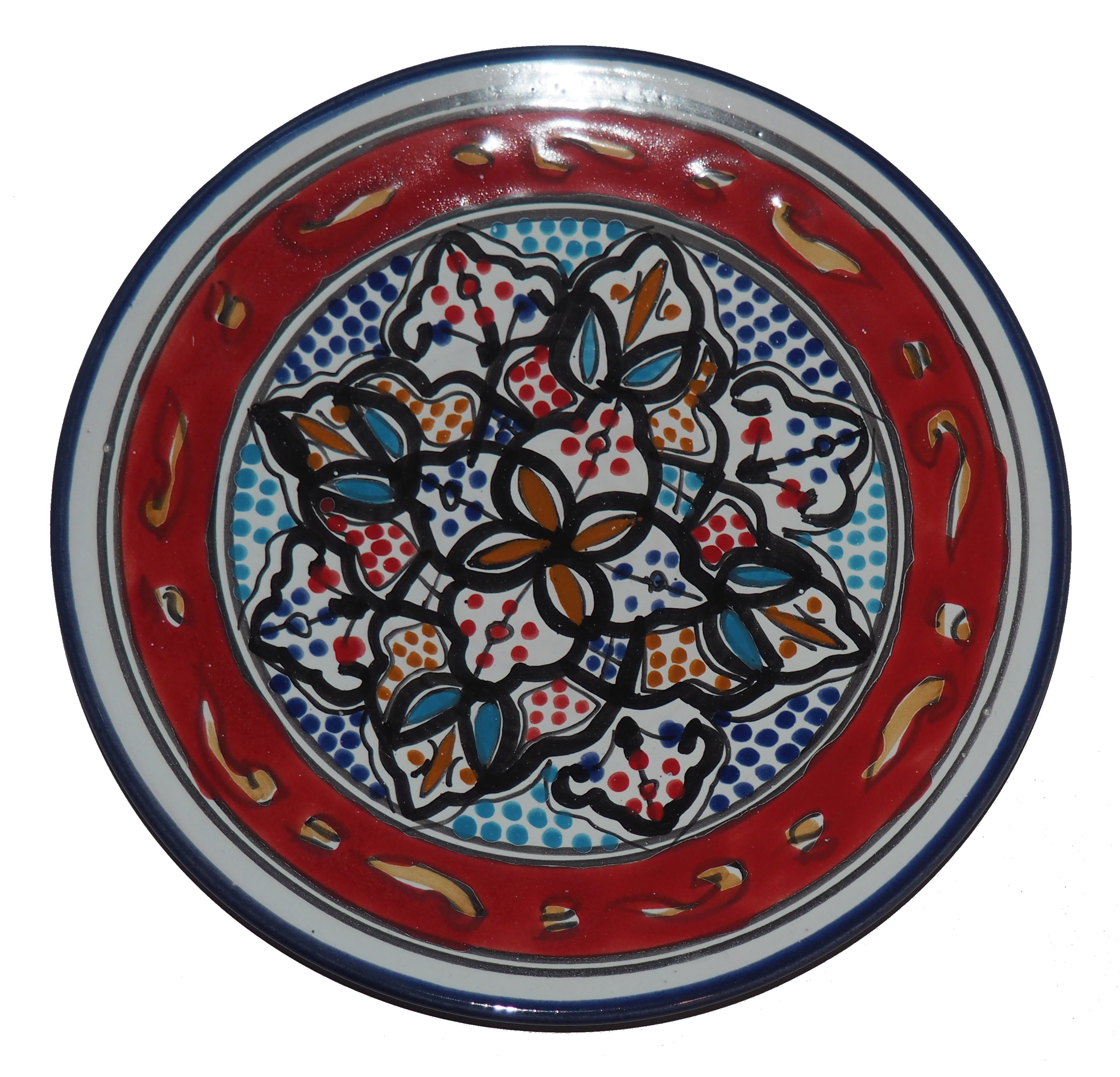 Ten orientalny talerz malowany jest w berberyjskie wzory. Przepiękna, niebanalna ozdoba Twojego stołu - ozdobny talerz prosto z Tunezji.