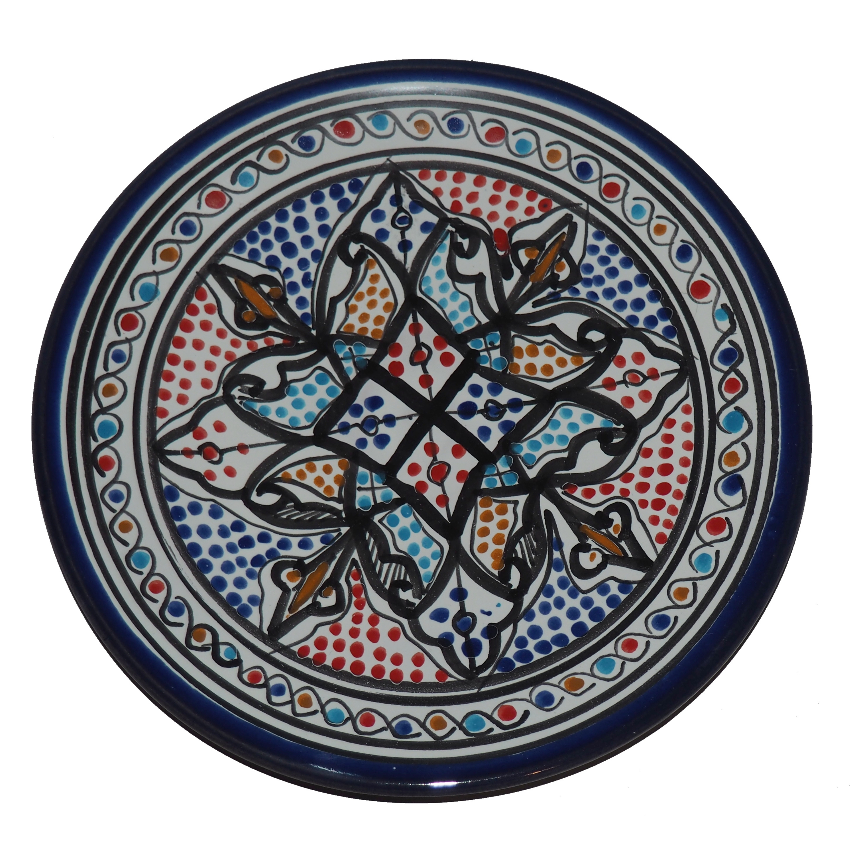 Ten orientalny talerz malowany jest w berberyjskie wzory. Przepiękna, niebanalna ozdoba Twojego stołu - ozdobny talerz prosto z Tunezji.
