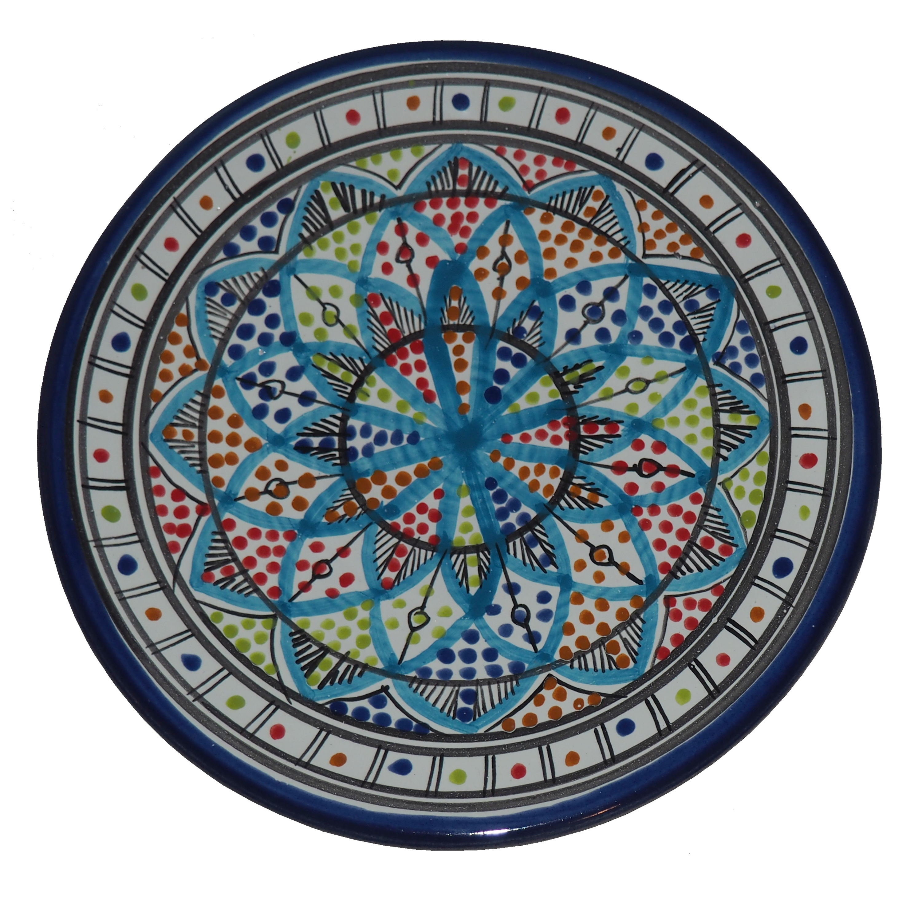 Ten orientalny talerz malowany jest w berberyjskie wzory. Przepiękna, niebanalna ozdoba Twojego stołu - ozdobny talerz prosto z Tunezji.
