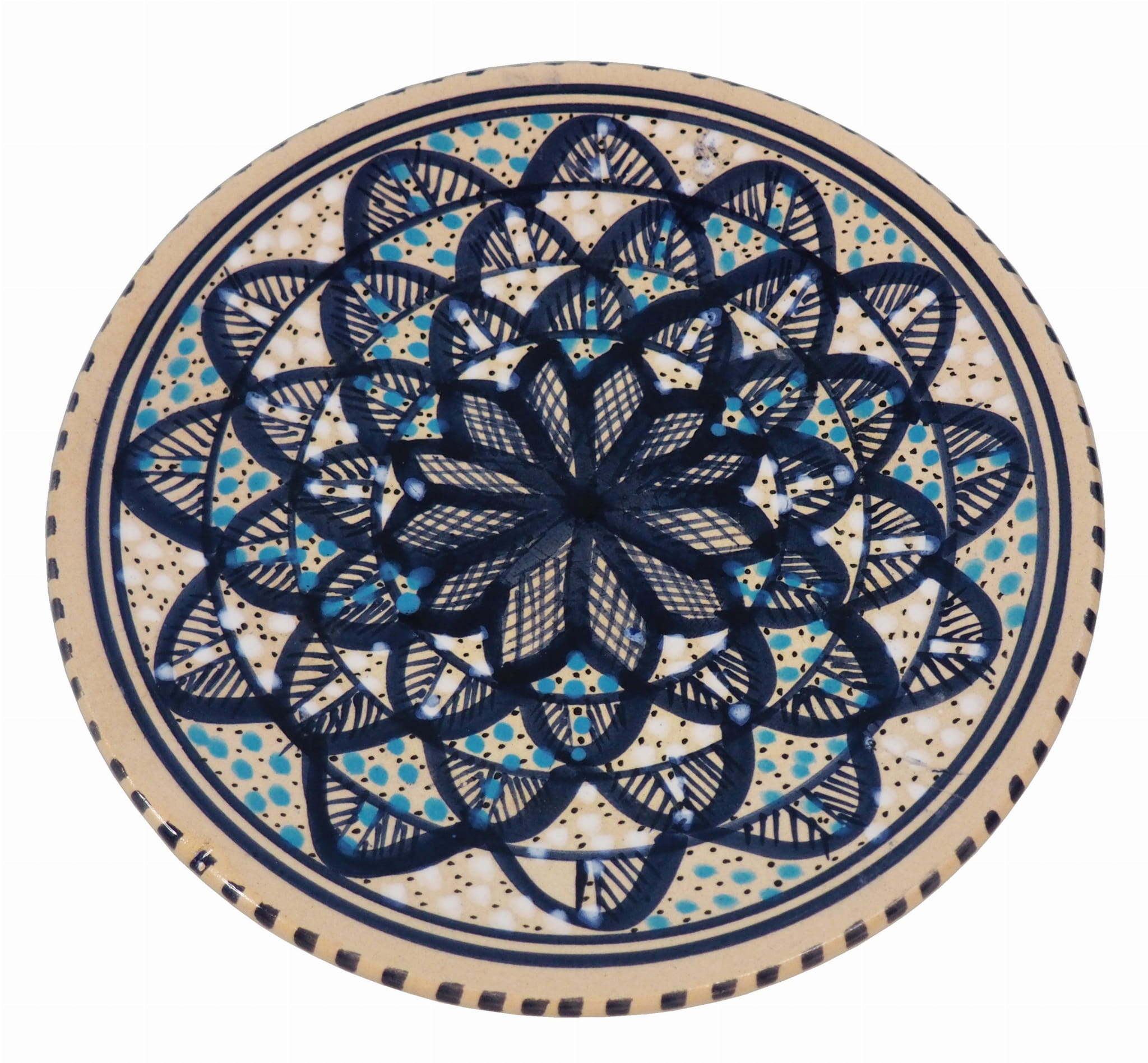 Ten orientalny talerz malowany jest w berberyjskie wzory. Przepiękna, niebanalna ozdoba Twojego stołu - ozdobny talerz prosto z Tunezji.