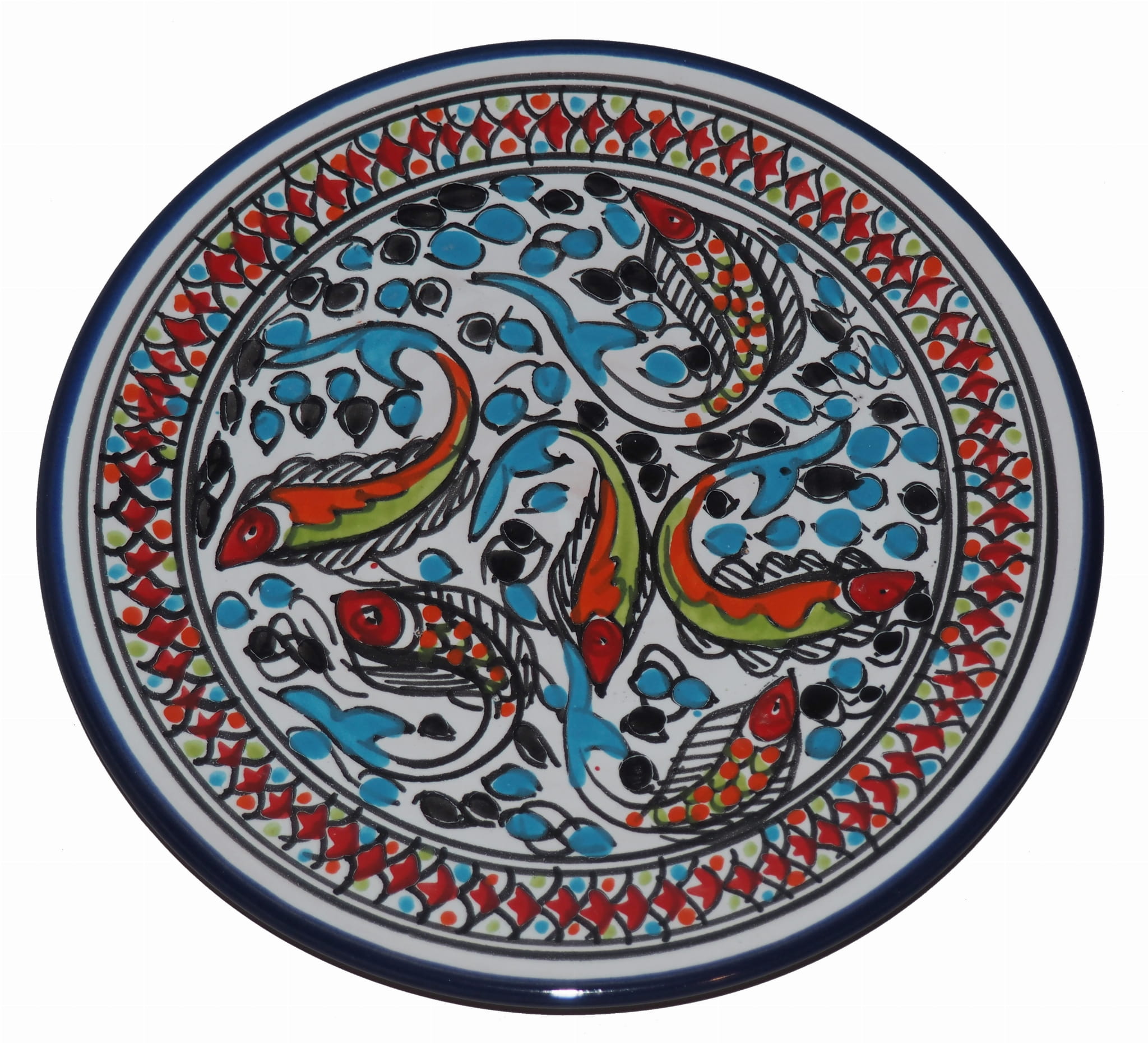 Ten orientalny talerz malowany jest w berberyjskie wzory. Przepiękna, niebanalna ozdoba Twojego stołu - ozdobna a jednocześnie funkcjonalna ceramika pochodząca prosto z Tunezji.
