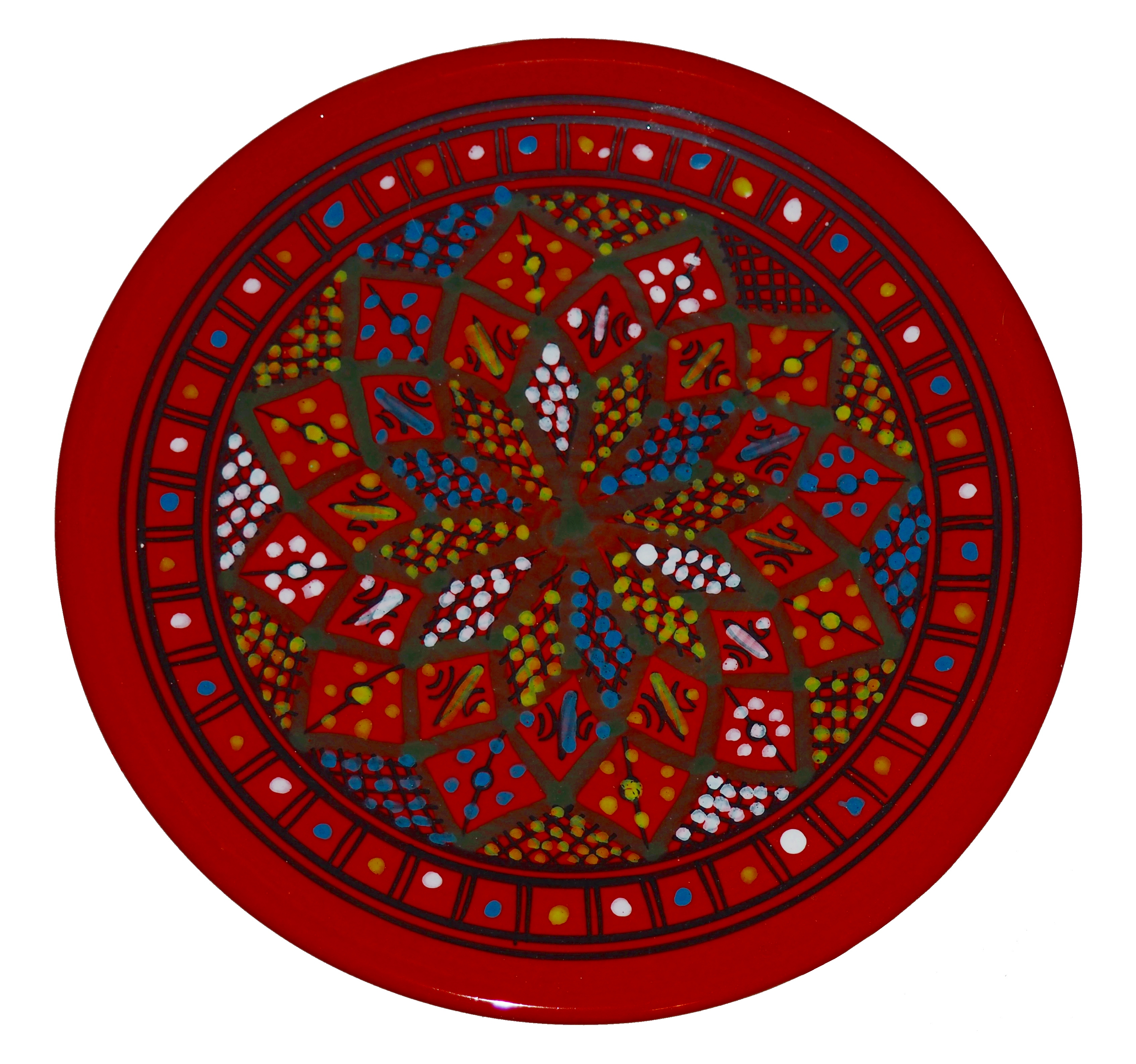 Ten orientalny talerz malowany jest w berberyjskie wzory. Przepiękna, niebanalna ozdoba Twojego stołu prosto z Tunezji.