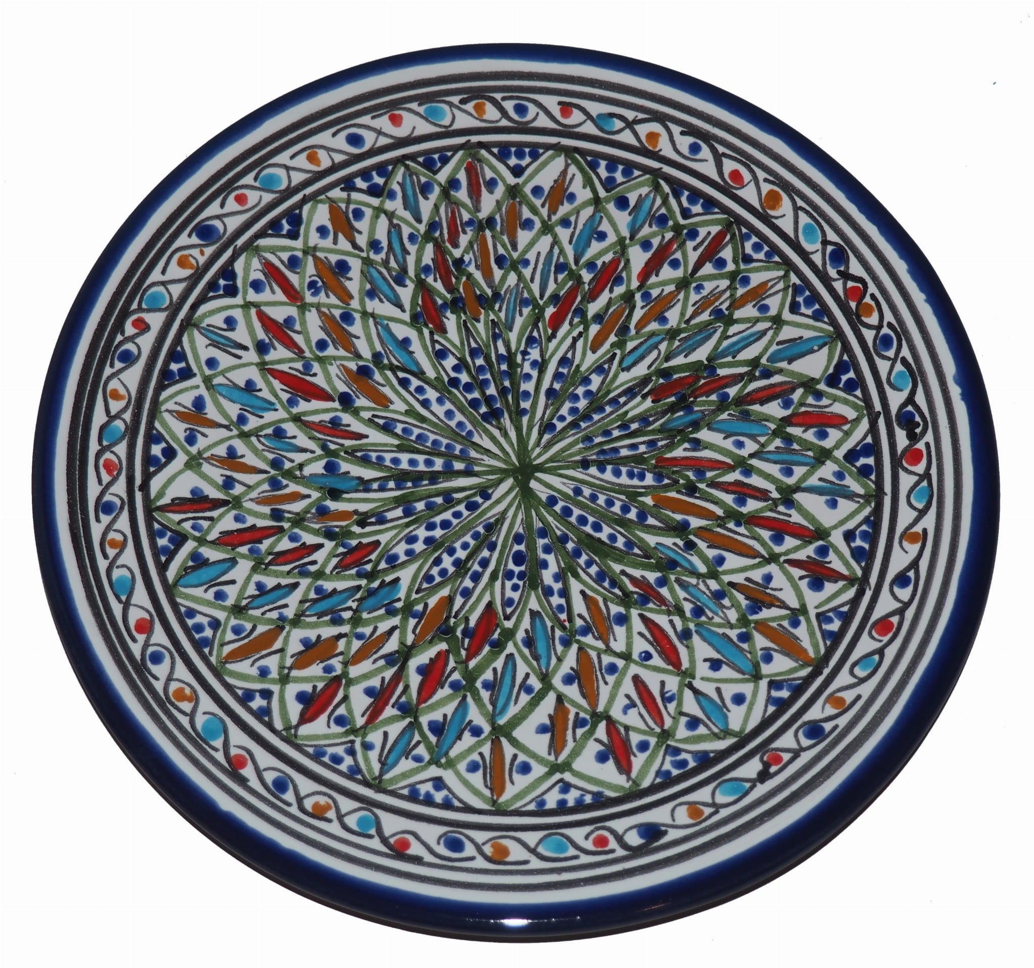 Ten orientalny talerz malowany jest w berberyjskie wzory. Przepiękna, niebanalna ozdoba Twojego stołu prosto z Tunezji.