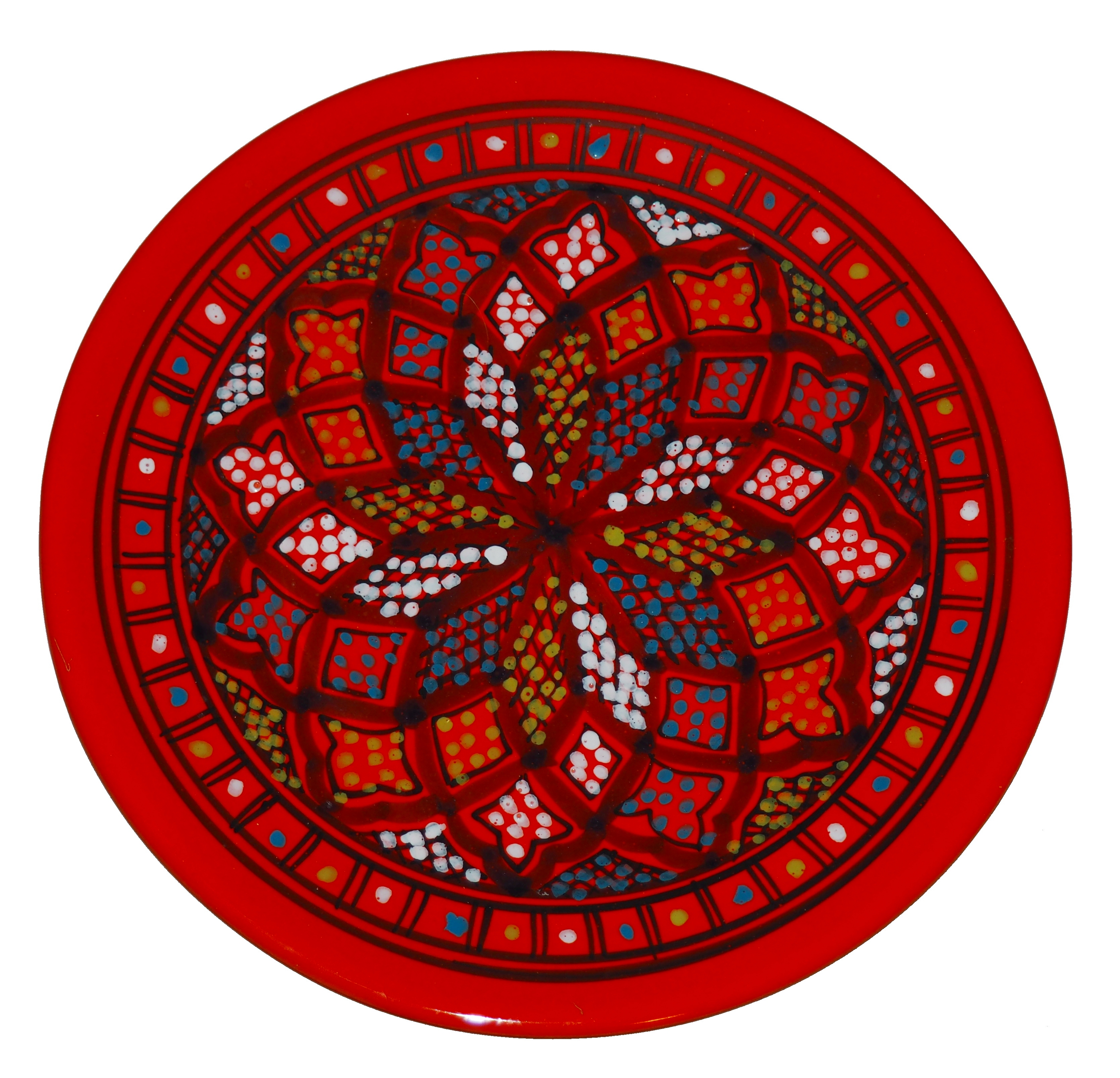 Ten orientalny talerz malowany jest w berberyjskie wzory. Przepiękna, niebanalna ozdoba Twojego stołu prosto z Tunezji.
