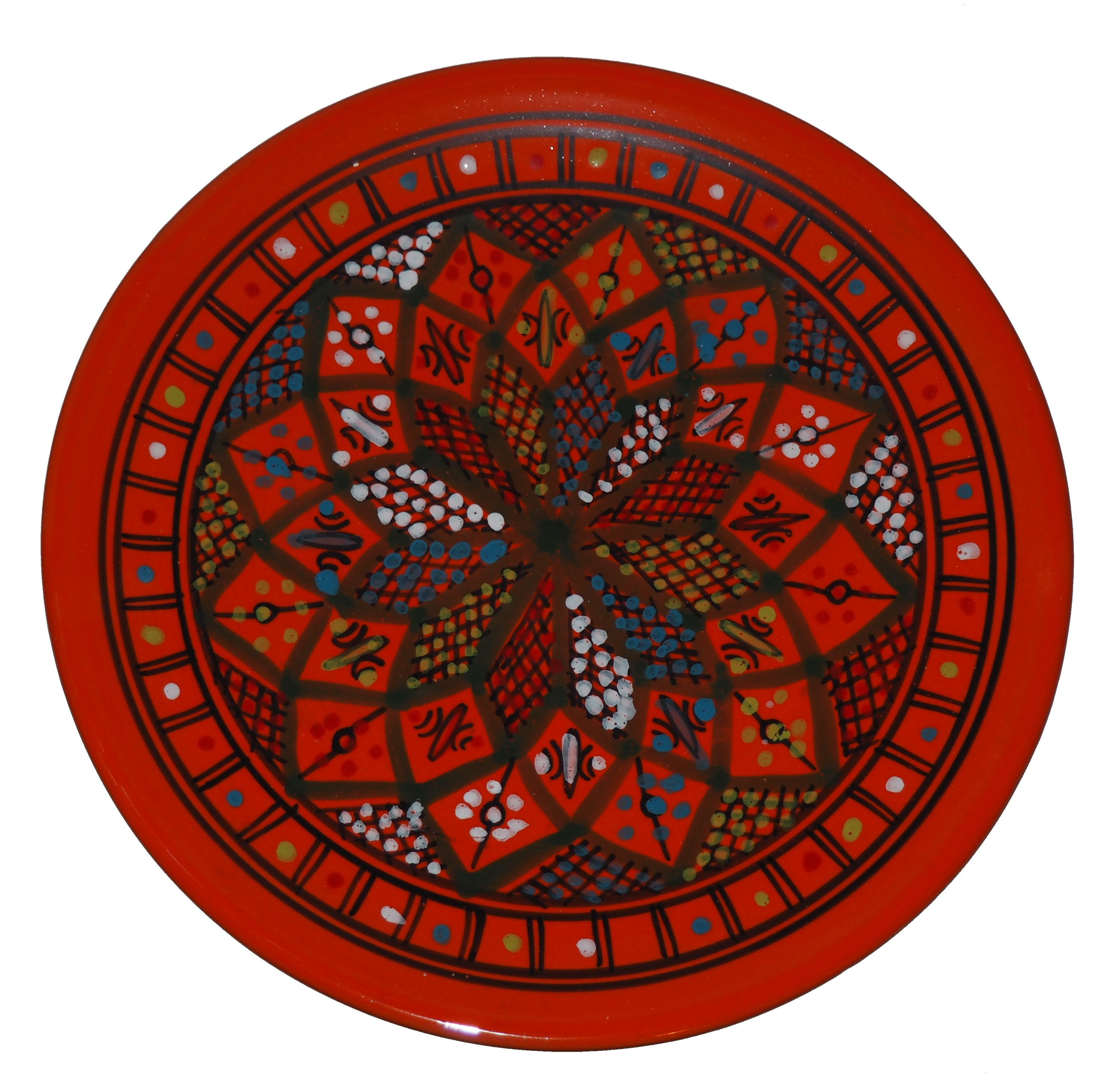 Ten orientalny talerz malowany jest w berberyjskie wzory. Przepiękna, niebanalna ozdoba Twojego stołu prosto z Tunezji.