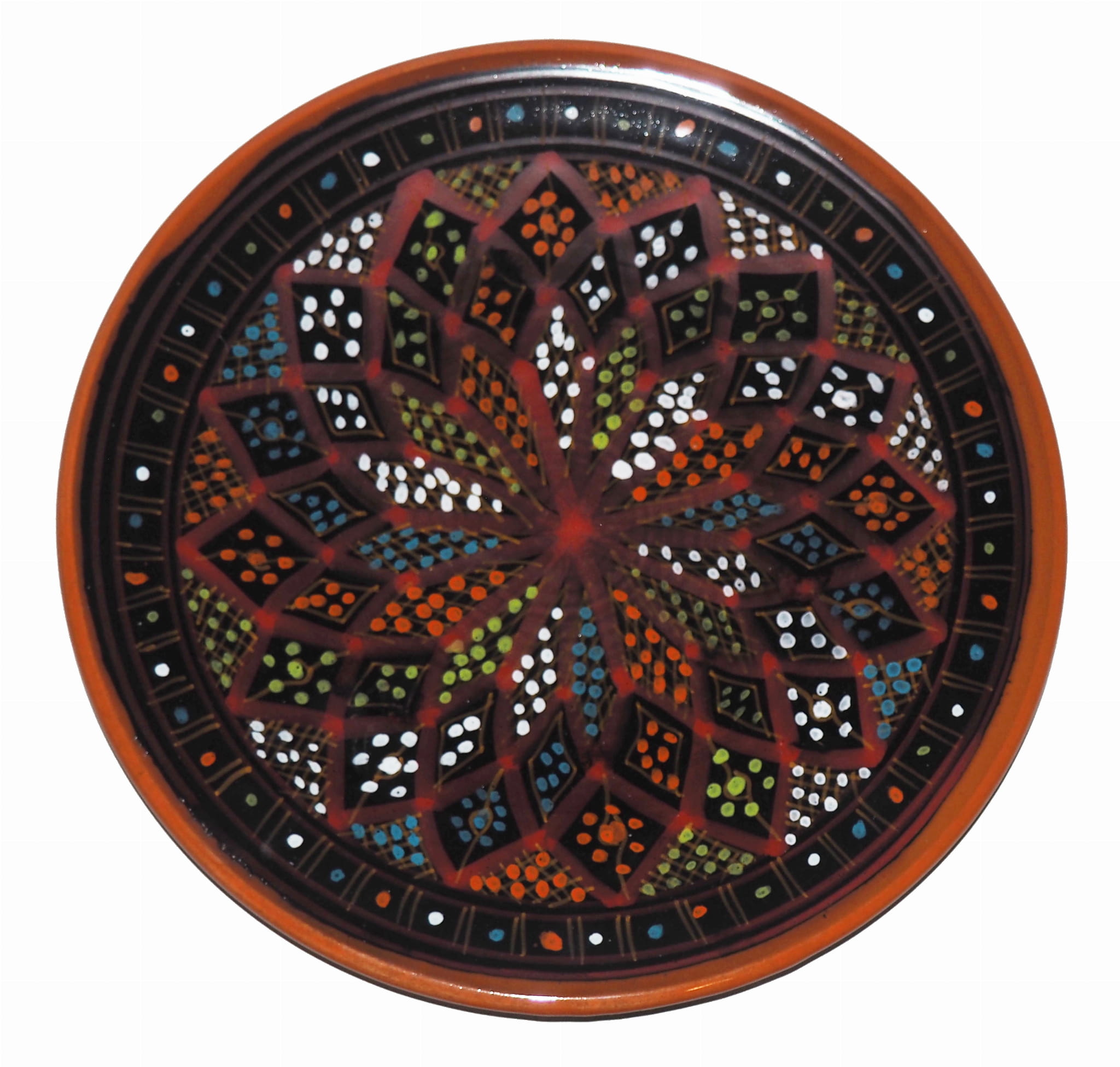 Ten orientalny talerz malowany jest w berberyjskie wzory. Przepiękna, niebanalna ozdoba Twojego stołu prosto z Tunezji.