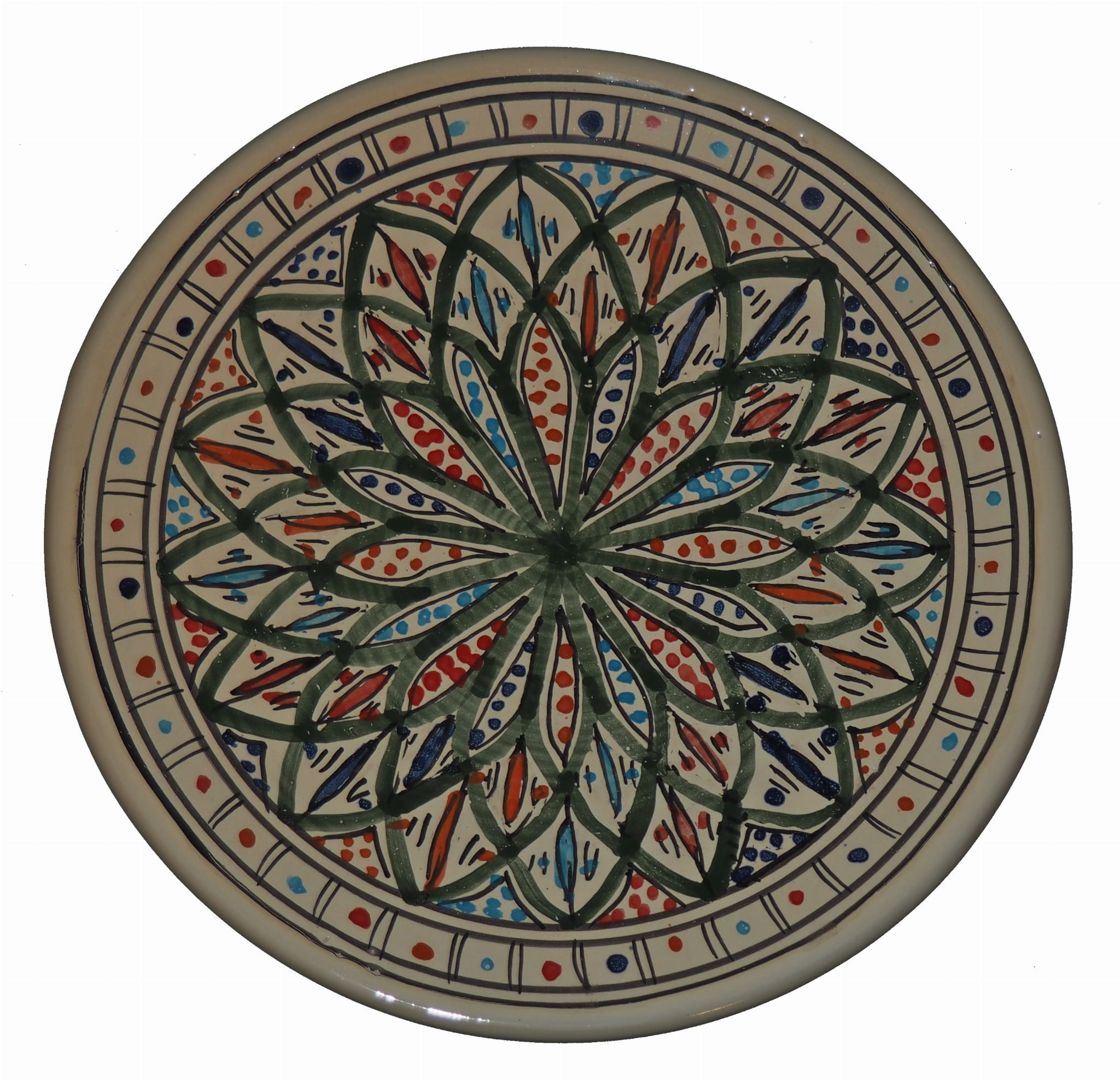 Ten orientalny talerz malowany jest w berberyjskie wzory. Przepiękna, niebanalna ozdoba Twojego stołu prosto z Tunezji.