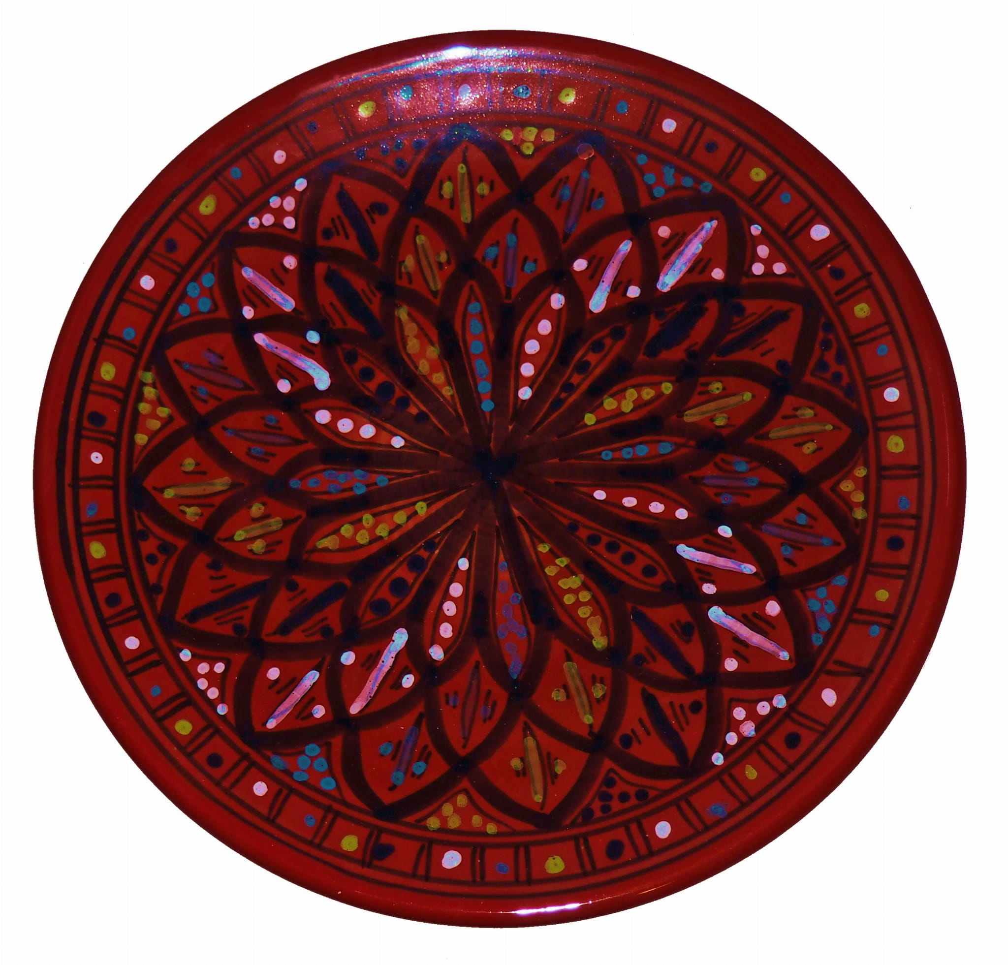 Ten orientalny talerz malowany jest w berberyjskie wzory. Przepiękna, niebanalna ozdoba Twojego stołu prosto z Tunezji.