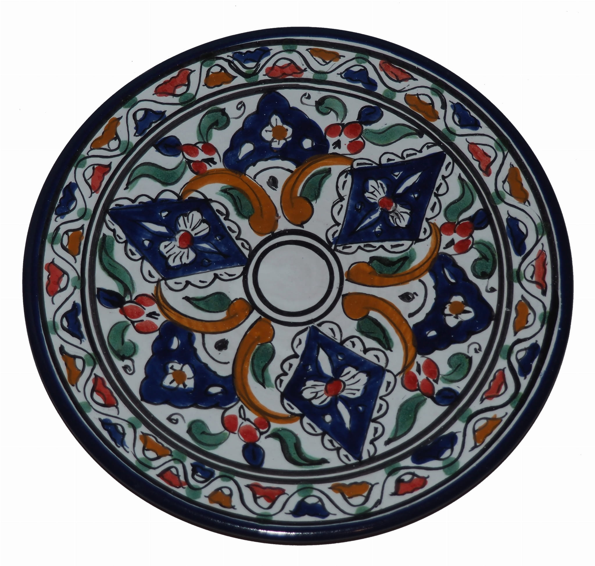 Ten orientalny talerz malowany jest w berberyjskie wzory. Przepiękna, niebanalna ozdoba Twojego stołu prosto z Tunezji.