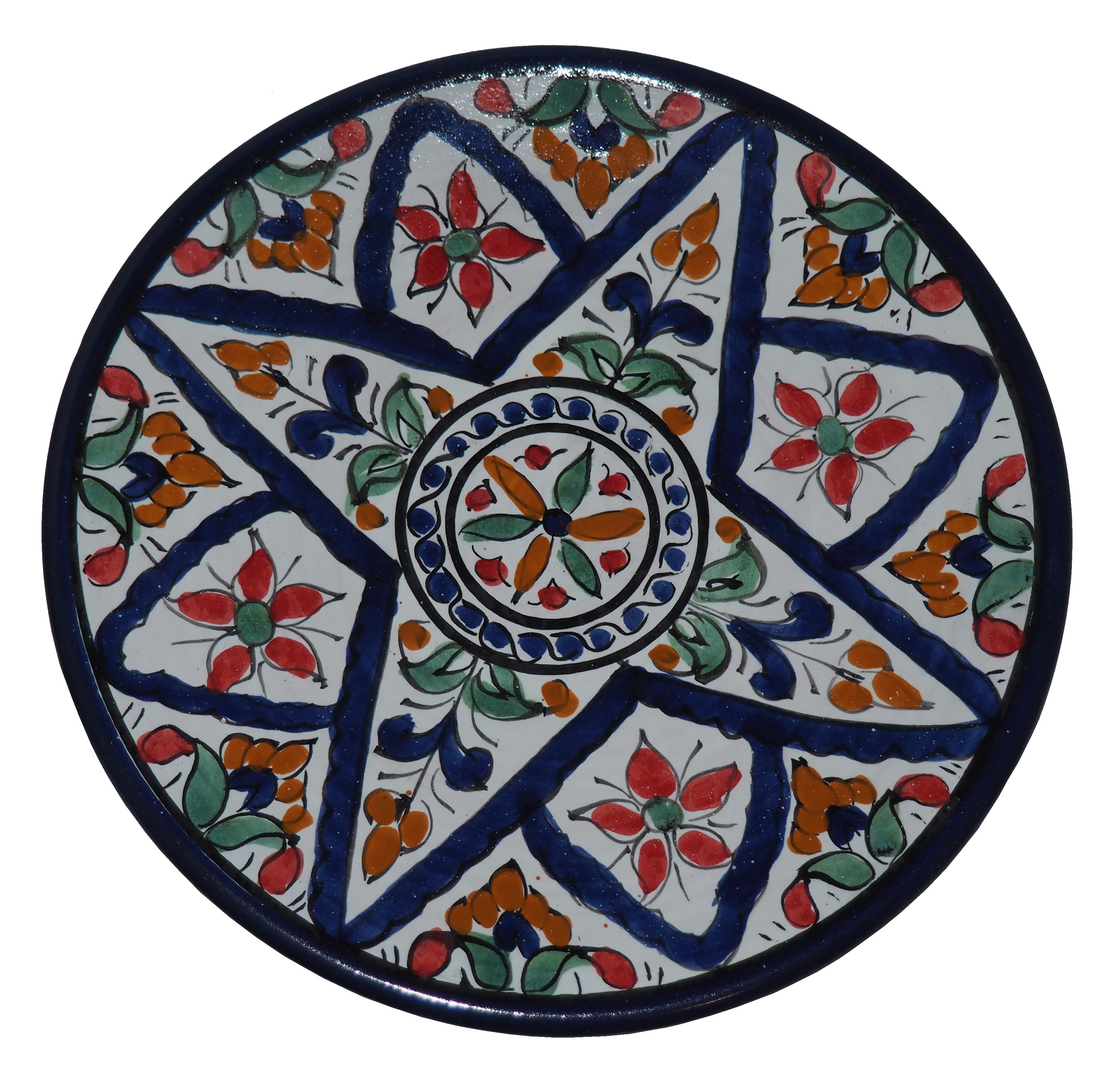 Ten orientalny talerz malowany jest w berberyjskie wzory. Przepiękna, niebanalna ozdoba Twojego stołu prosto z Tunezji.