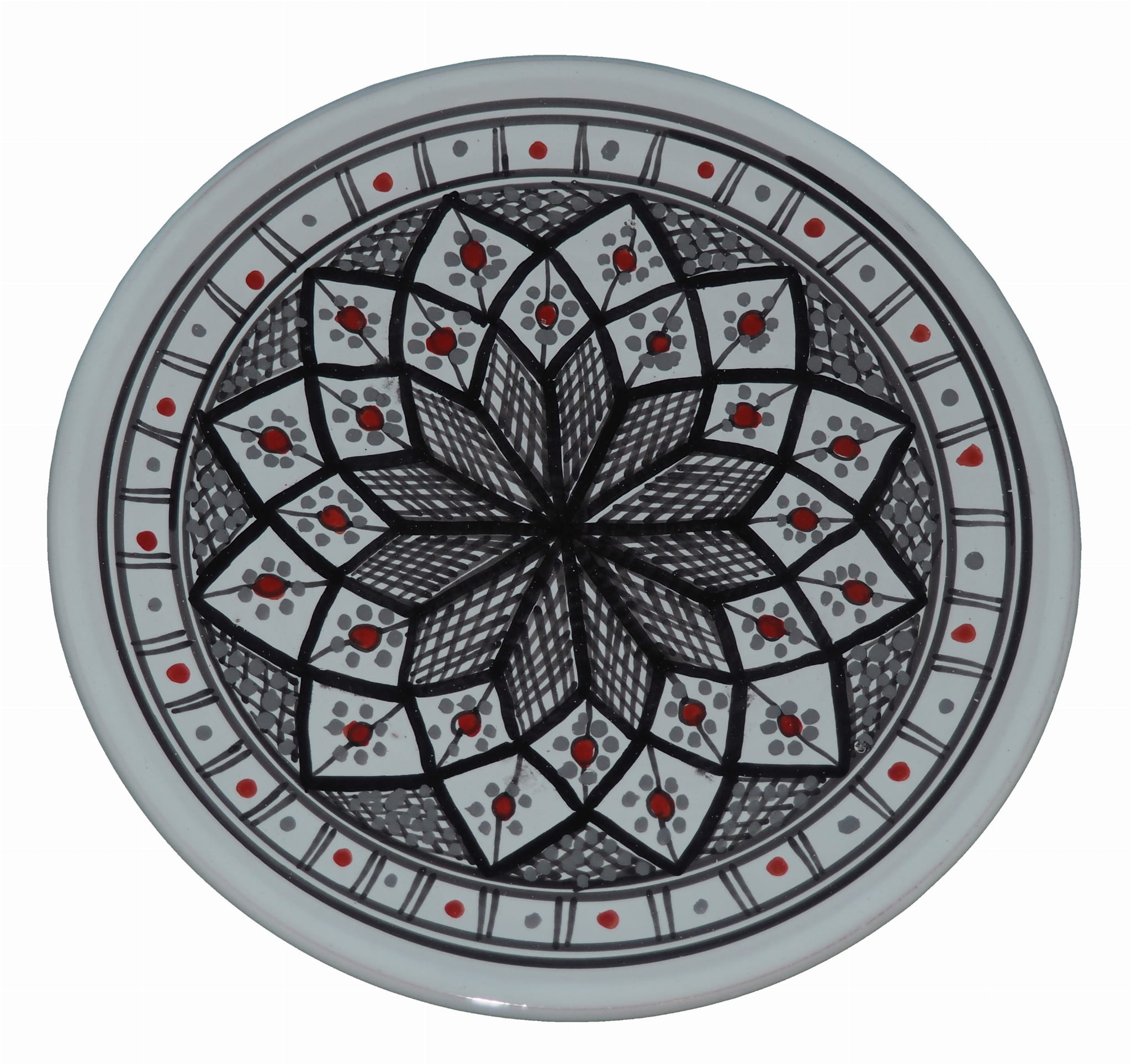 Ten orientalny talerz malowany jest w berberyjskie wzory. Przepiękna, niebanalna ozdoba Twojego stołu prosto z Tunezji.