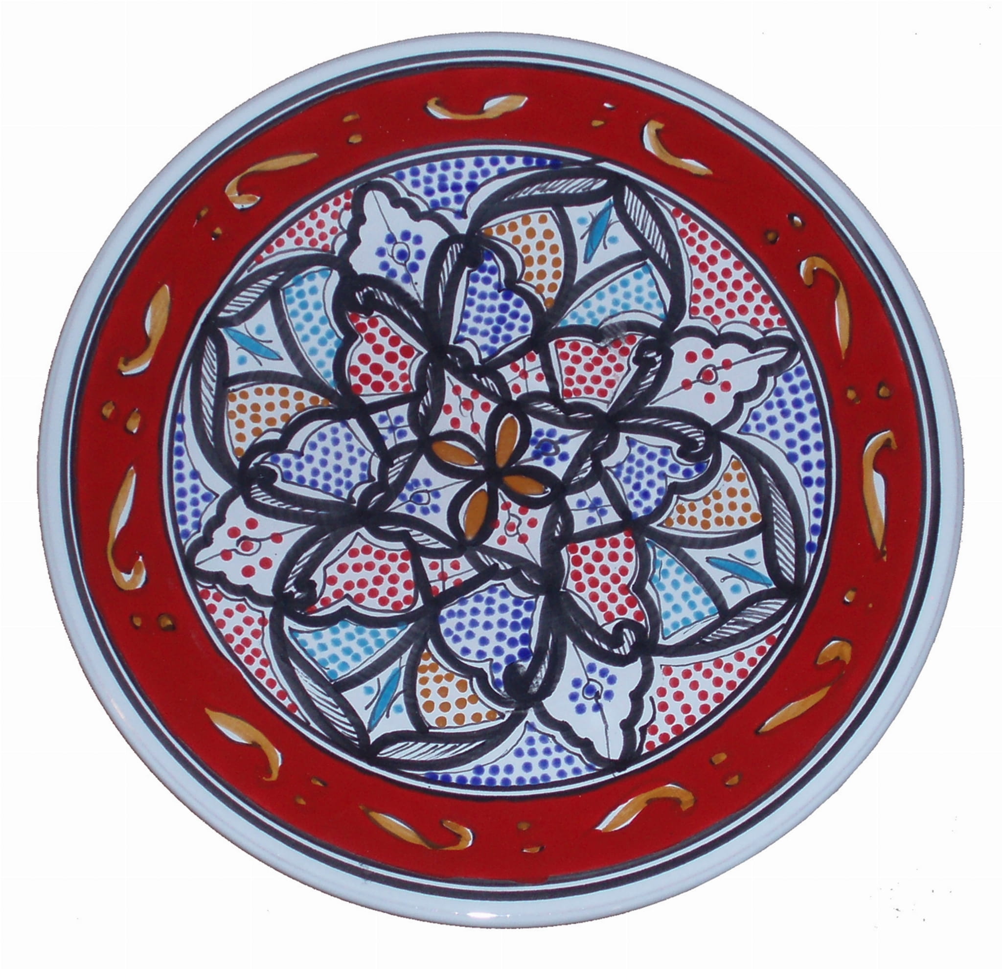 Orientalny talerz malowany jest w berberyjskie wzory. Przepiękna, niebanalna ozdoba Twojego stołu - ozdobna ceramika prosto z Tunezji.
