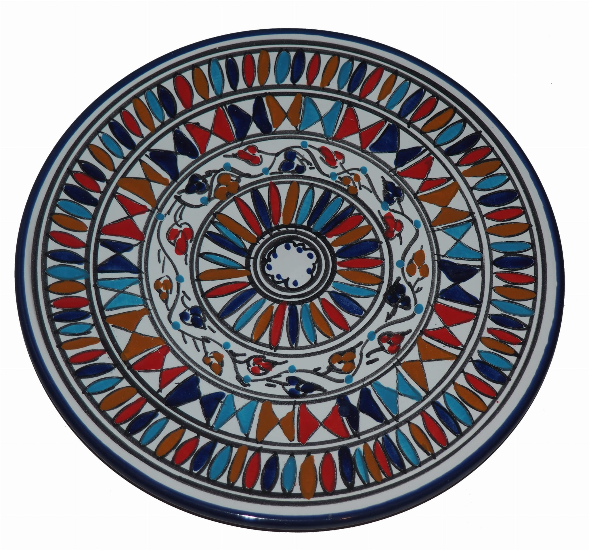 Orientalny talerz malowany jest w berberyjskie wzory. Przepiękna, niebanalna ozdoba Twojego stołu - ozdobna ceramika prosto z Tunezji.