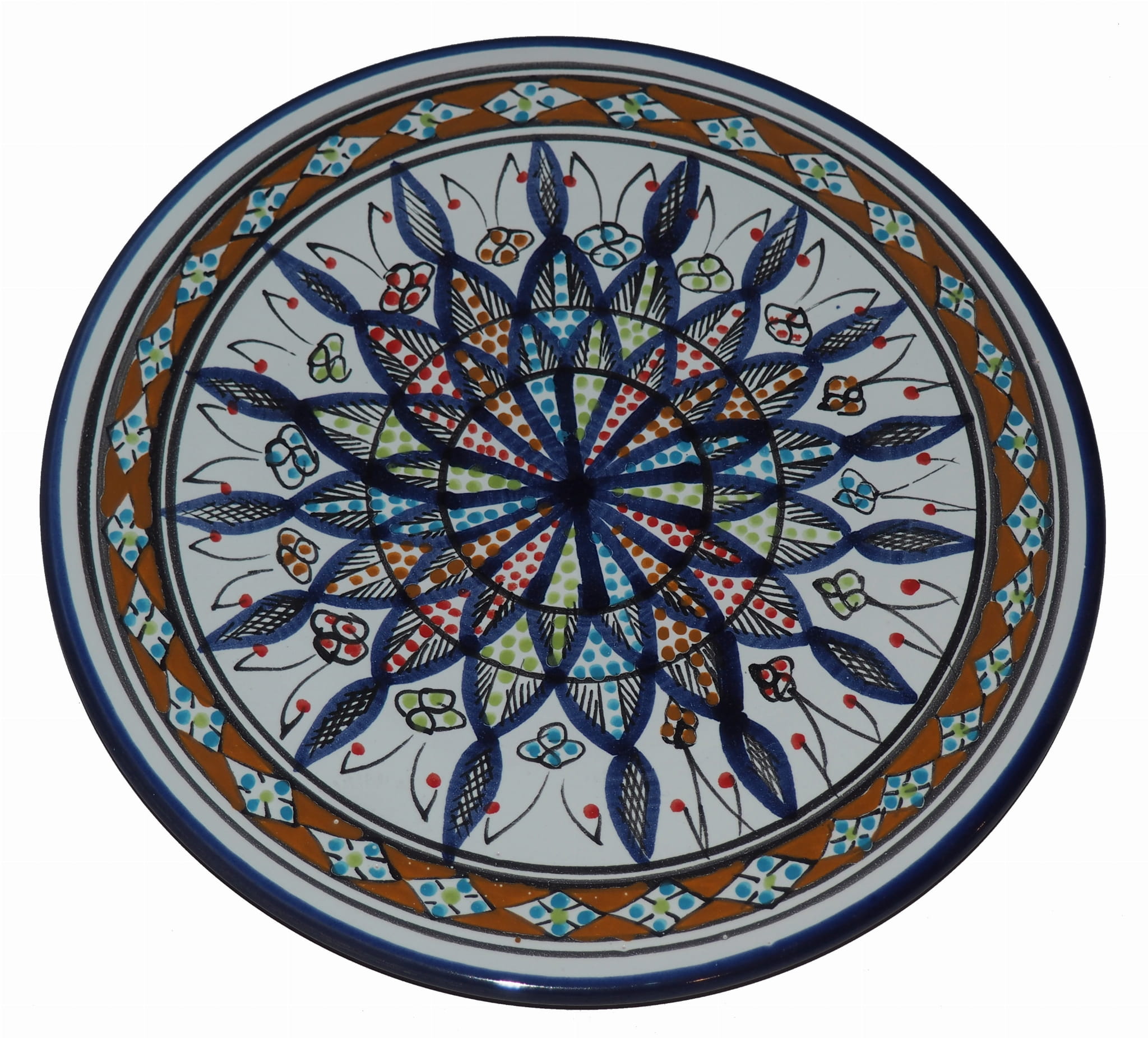 Orientalny talerz malowany jest w berberyjskie wzory. Przepiękna, niebanalna ozdoba Twojego stołu - ozdobna ceramika prosto z Tunezji.