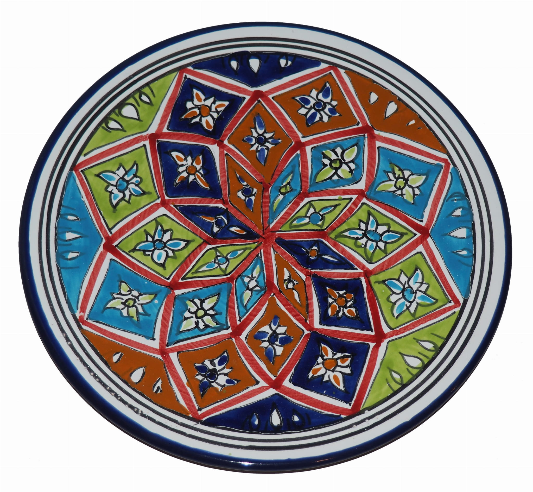 Orientalny talerz malowany jest w berberyjskie wzory. Przepiękna, niebanalna ozdoba Twojego stołu - ozdobna ceramika prosto z Tunezji.