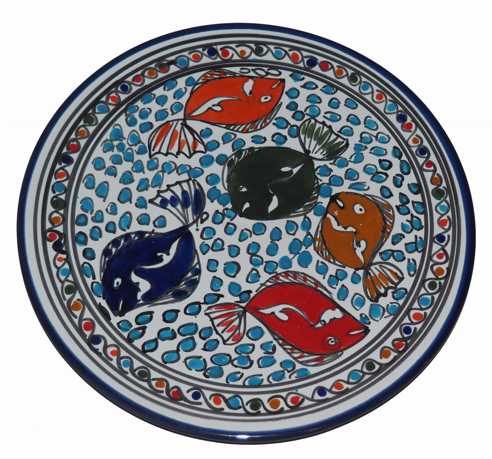 Orientalny talerz malowany jest w berberyjskie wzory. Przepiękna, niebanalna ozdoba Twojego stołu - ozdobna ceramika prosto z Tunezji.