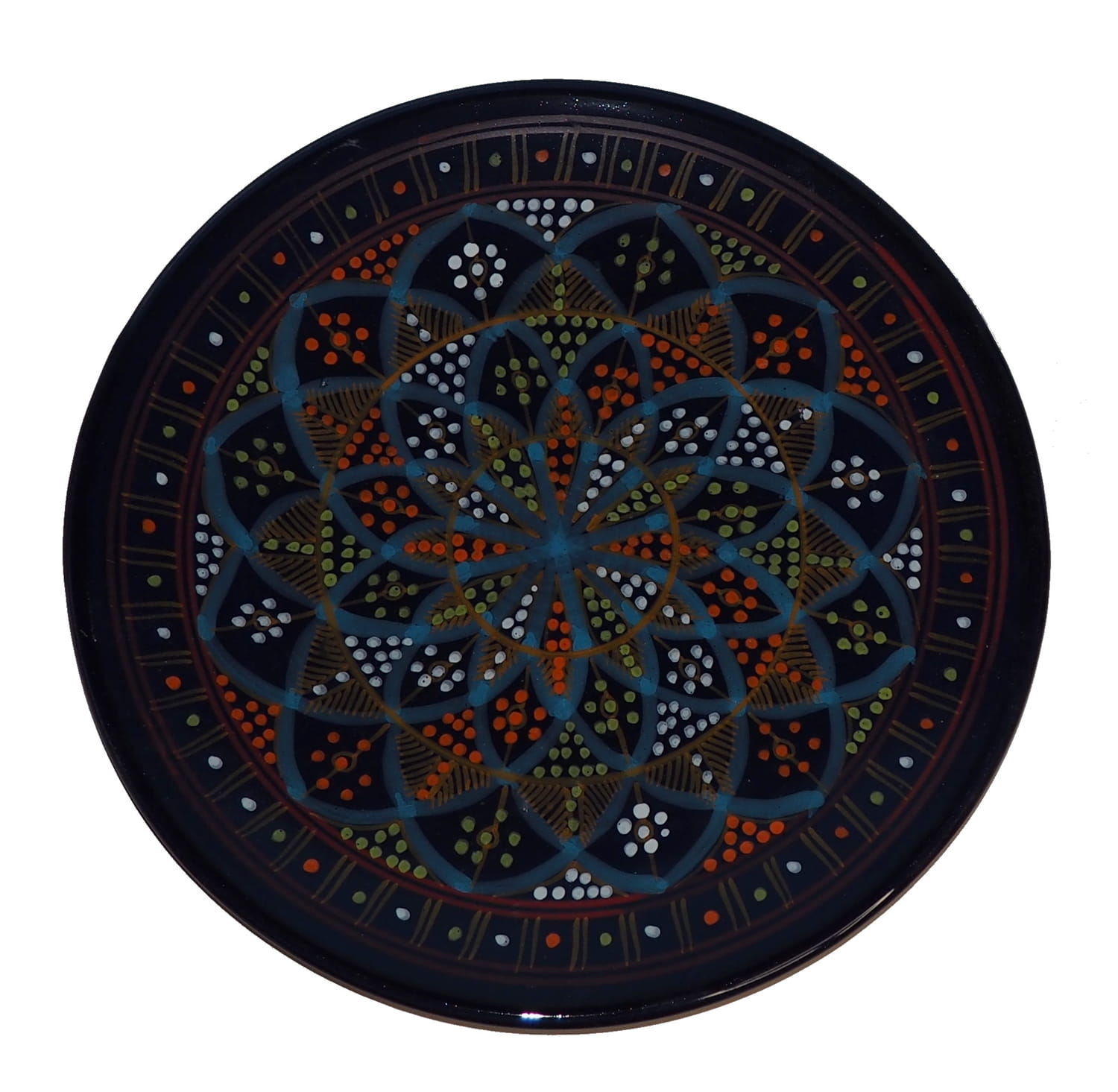 Orientalny talerz malowany jest w berberyjskie wzory. Przepiękna, niebanalna ozdoba Twojego stołu - ozdobna ceramika prosto z Tunezji.