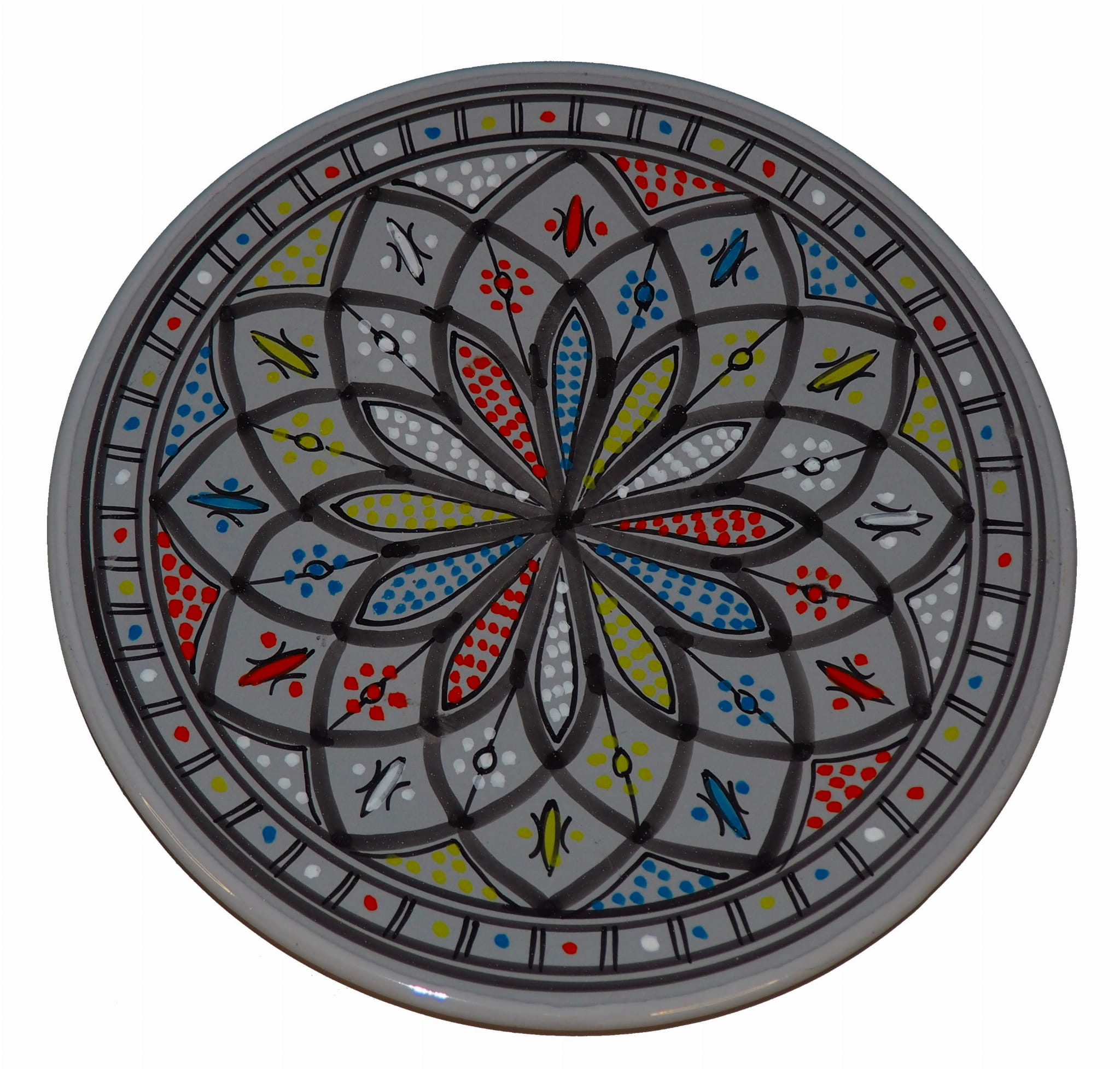 Orientalny talerz malowany jest w berberyjskie wzory. Przepiękna, niebanalna ozdoba Twojego stołu - ozdobna ceramika prosto z Tunezji.