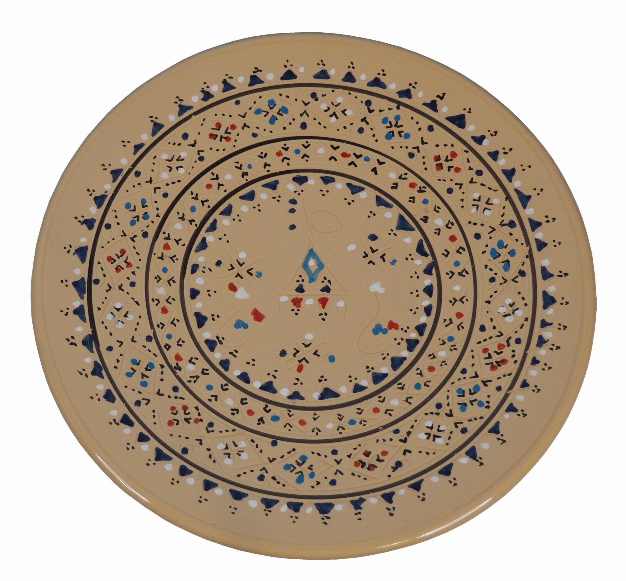 Orientalny talerz malowany jest w berberyjskie wzory. Przepiękna, niebanalna ozdoba Twojego stołu - ozdobna ceramika prosto z Tunezji.
