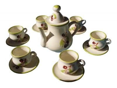 Ten duży, ceramiczny komplet składa się z : czajnika z pokrywką o wysokości 22cm, 6 filiżanek o wymiarach: wysokość filiżanki 8cm, średnica 8 cm.